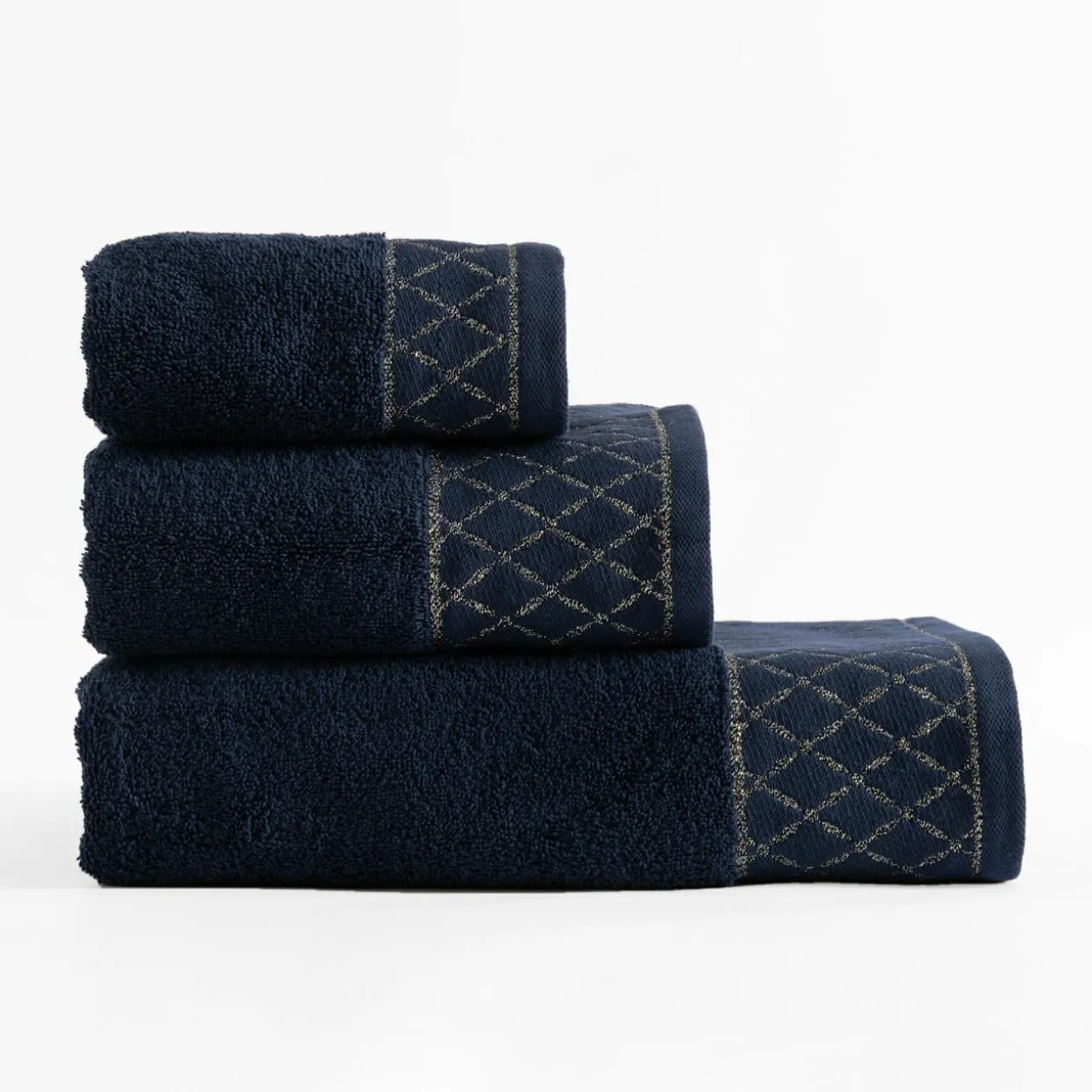 - Granatowy ręcznik wyróżnisz na tle kremowych lub białych ścian.