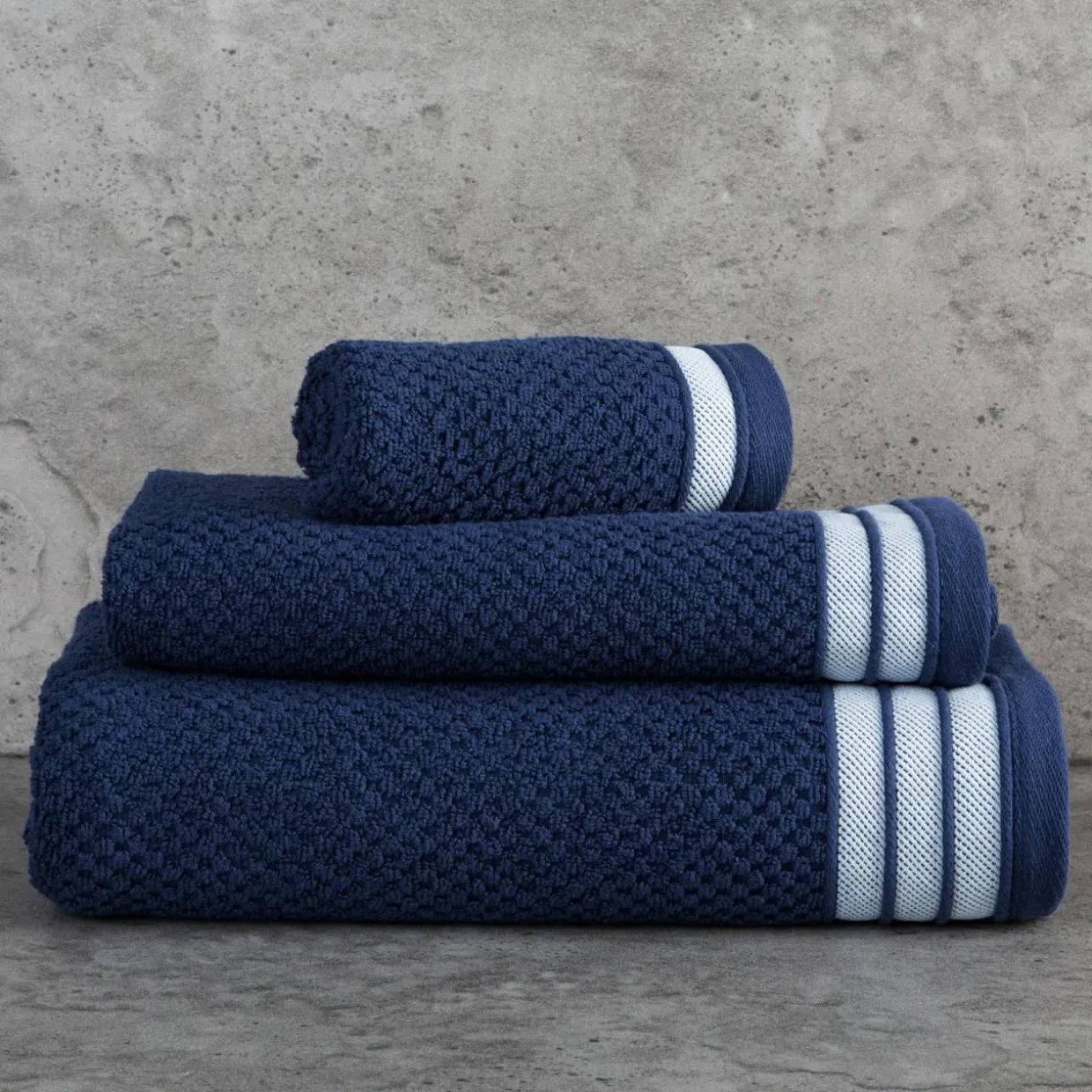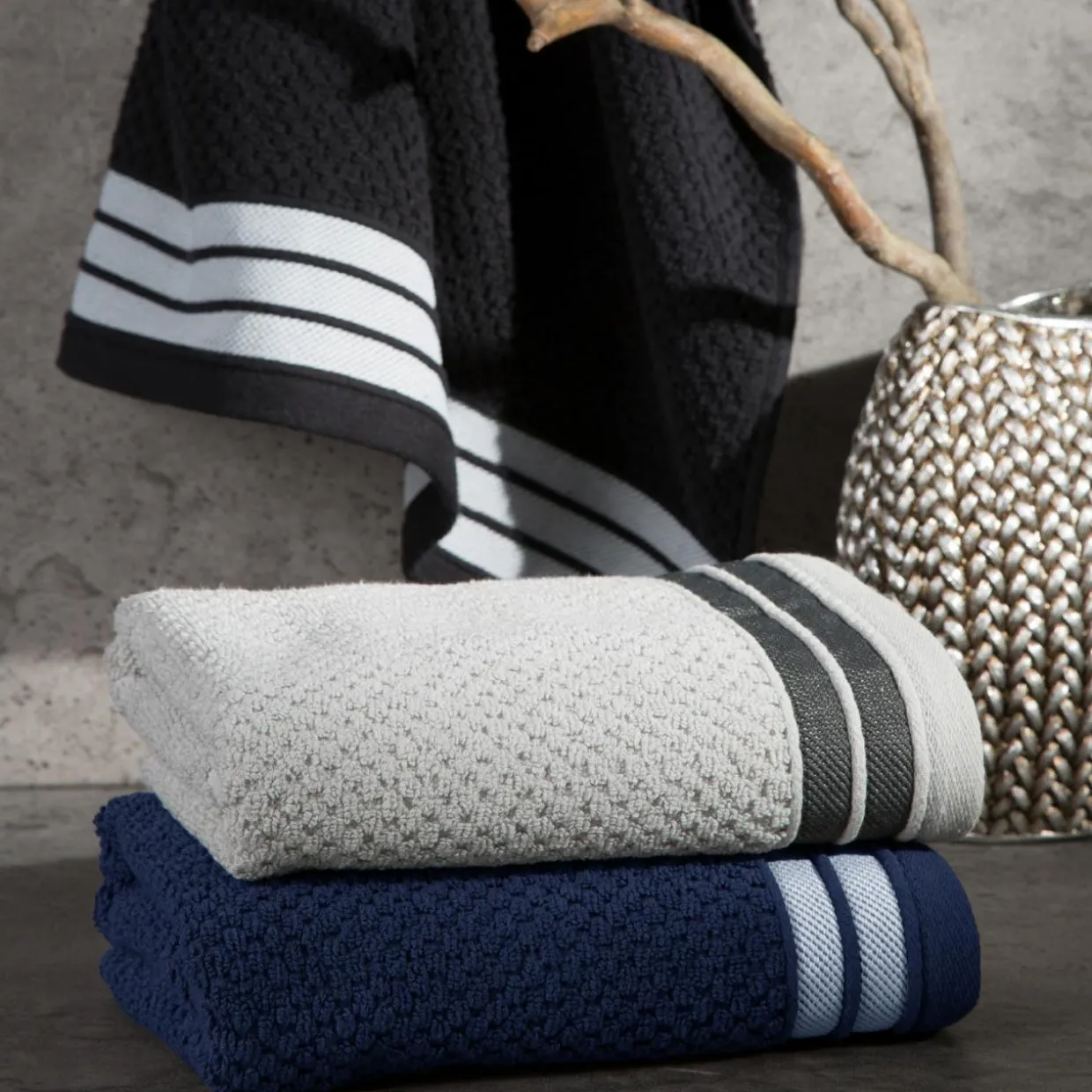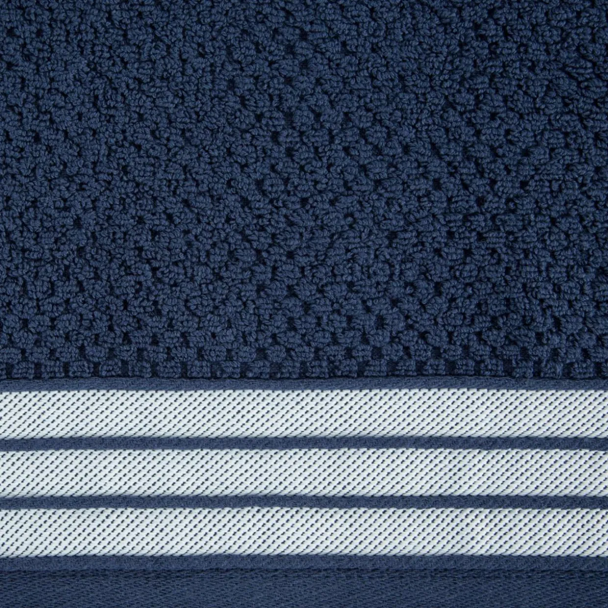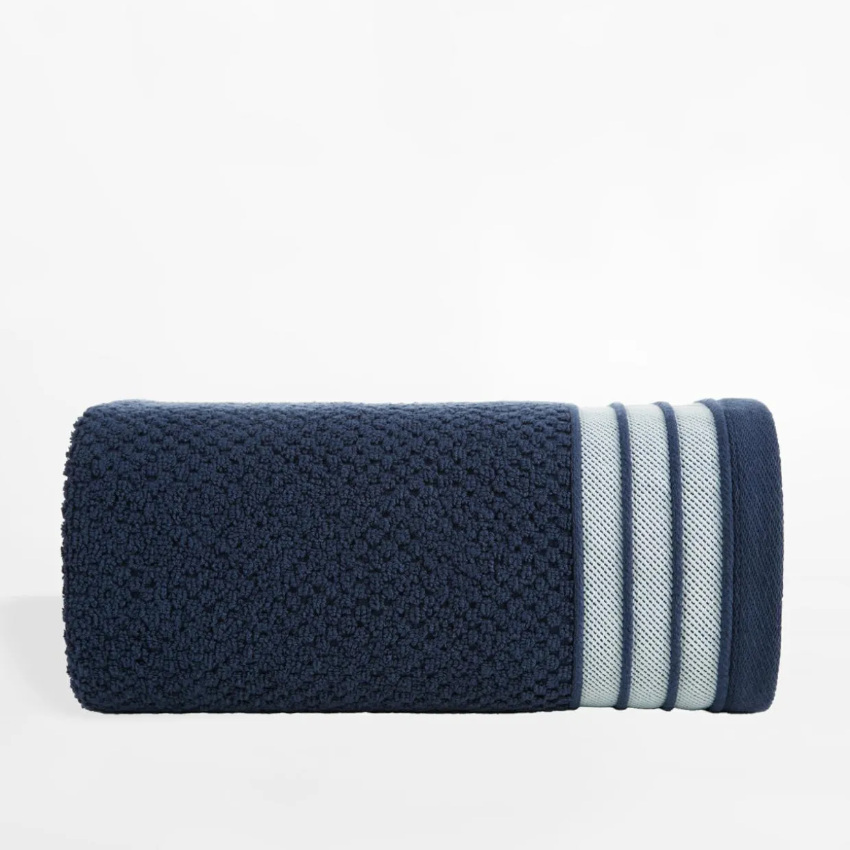 Granatowy ręcznik MADLEN o ryżowej strukturze w połączeniu z ozdobną bordiurą zyskuje oryginalny i elegancki wygląd. Ozdobi łazienkę w nowoczesnym stylu.