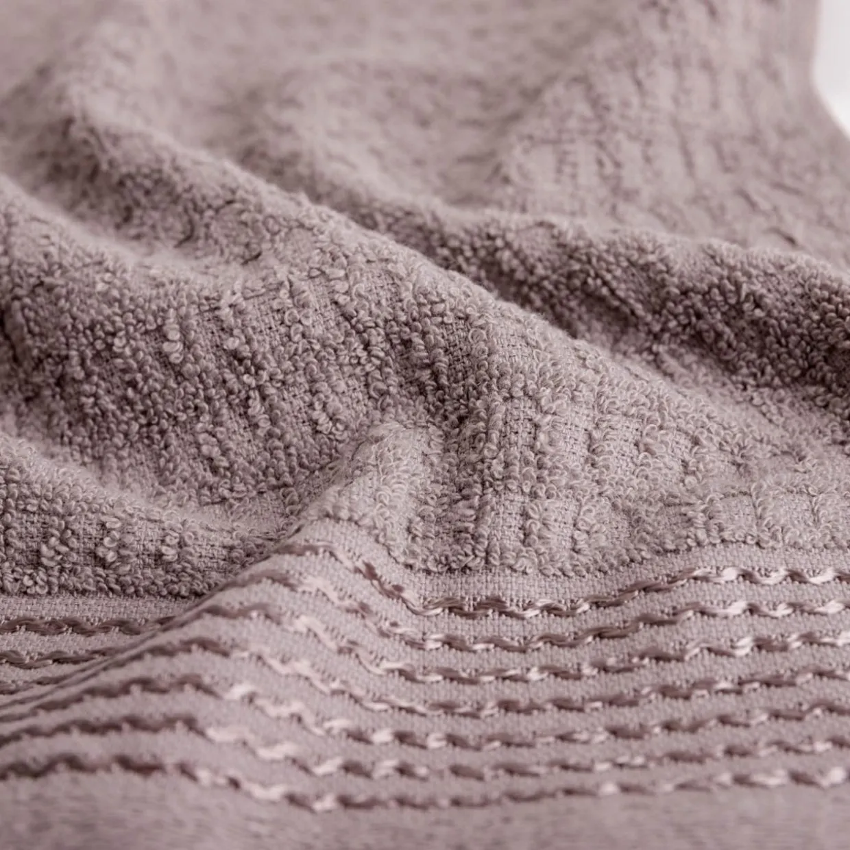 Ręcznik kuchenny HAPPY o dekoracyjnej fakturze wyróżnia się lekko błyszczącą bordiurą – doda wnętrzu eleganckiego akcentu.