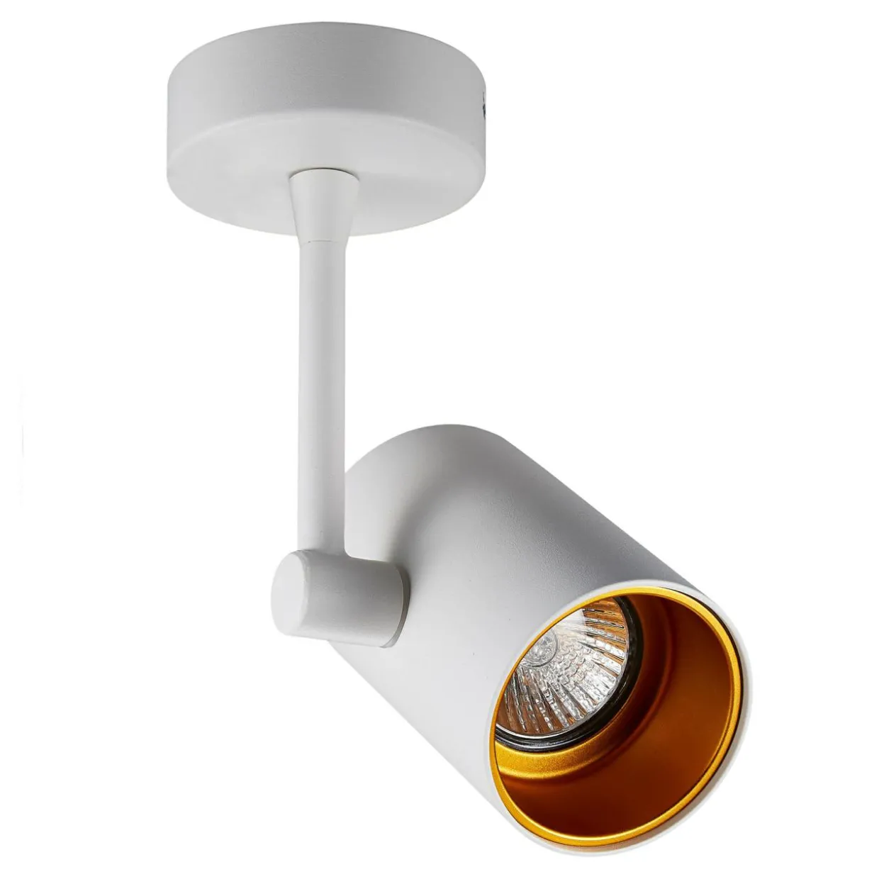 - Biały kolor obudowy ze złotym wnętrzem sprawia, że spot pięknie koresponduje z jasną oprawą mebli oraz ścian.