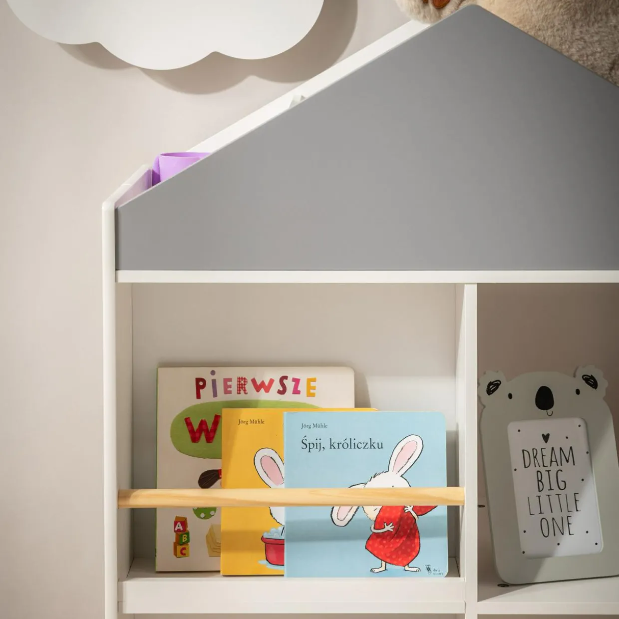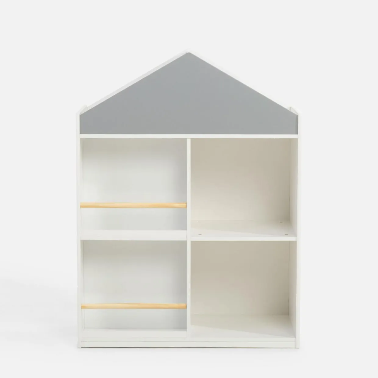 Regał w kształcie domku GUSISI ma aż 10 wnęk do przechowywania. Zmieścicie w nim ulubione książeczki, pluszaki lub inne zabawki. Może pełnić funkcję regalu lub zmienić się w domek dla misiów lub lalek.