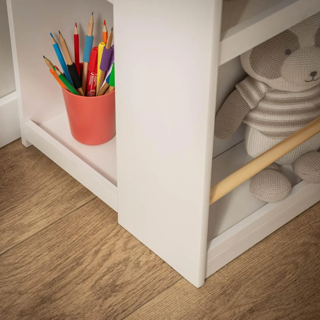 - 2 półki boczne – 22×34,5×32 cm – mogą stanowić schronienie dla zabawek lub schowek na pledy i koce