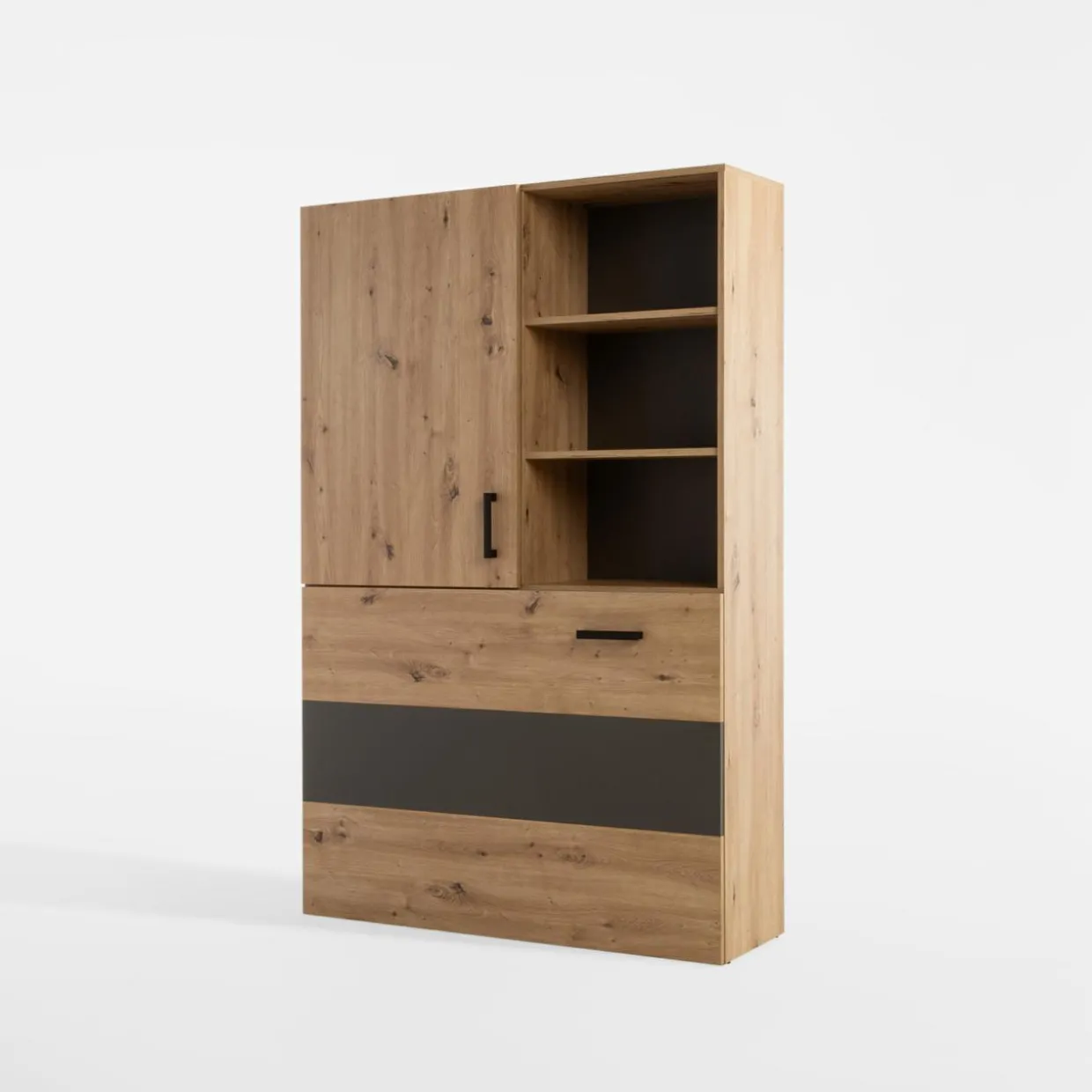 Na co dzień będzie zwykłym regałem. Gdy przyjdzie czas na naukę lub pracę w domu, otwórz i rozłóż biurko OXFORD. Ten niepozorny mebel wykorzystasz w mniejszych gabinetach domowych, pokoju młodzieżowym lub kawalerce.
