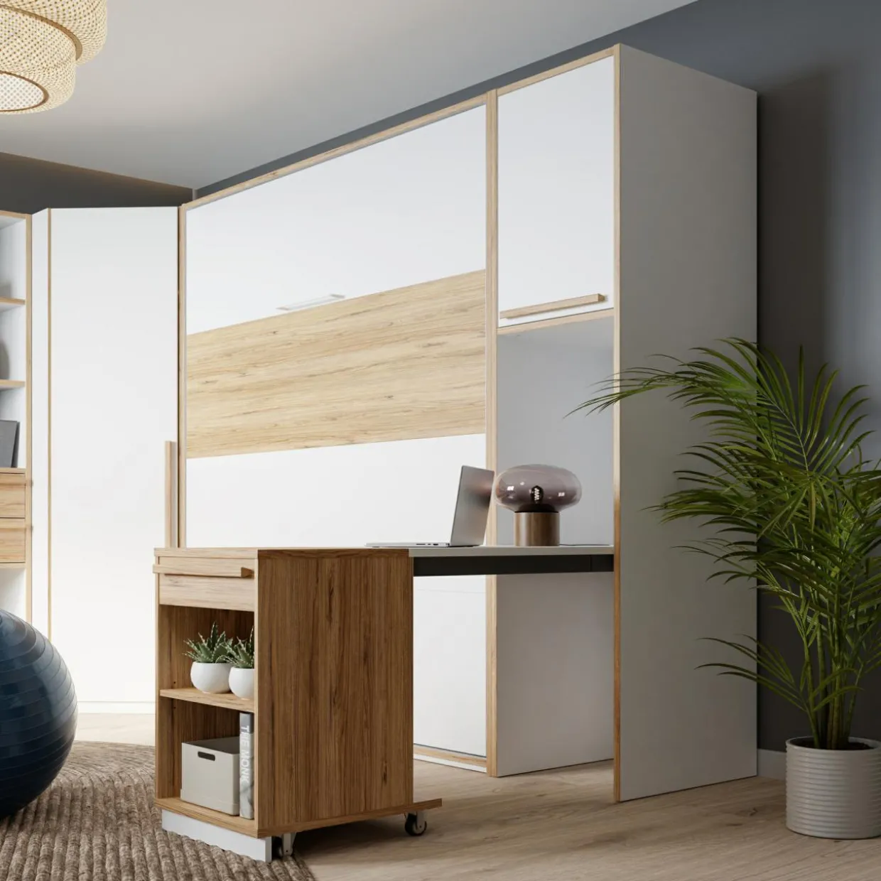 - Ich największym atutem są składane elementy: składane łóżko, które wygląda jak szafa, biurko stolik wsuwany w korpus regału i rozkładane biurko.