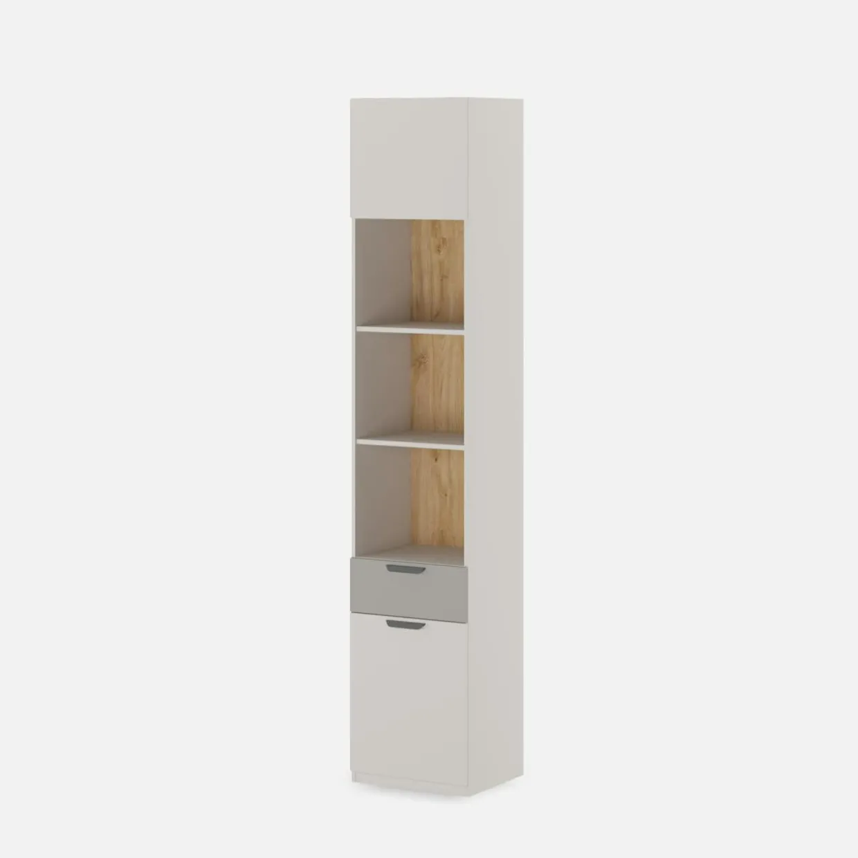 Regał MAX MODERN II pozwala wyeksponować część książek i pamiątek. Resztę schowasz za zabudowanym frontem.