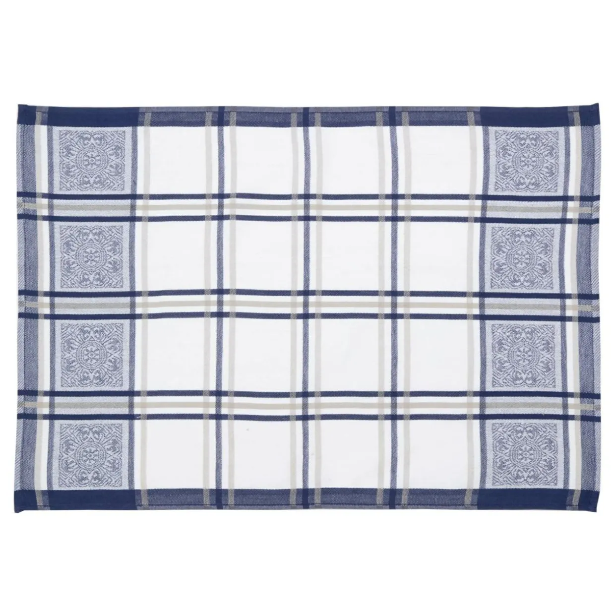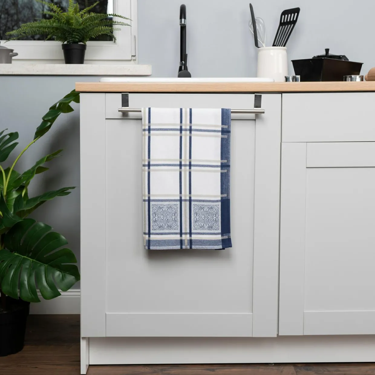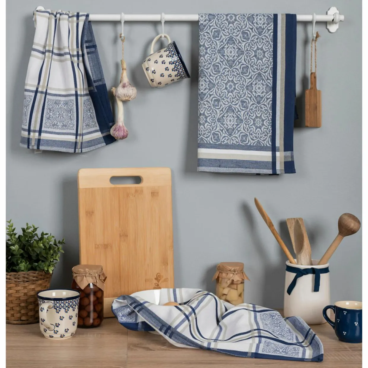 Ścierka kuchenna MAJOLICA wykonana w 100% z bawełny to doskonały wybór! Granatowe pasy wzbogacone o ciekawy wzór sprawiają, że całość prezentuje się niezwykle efektownie i staje się ozdobą pomieszczenia.