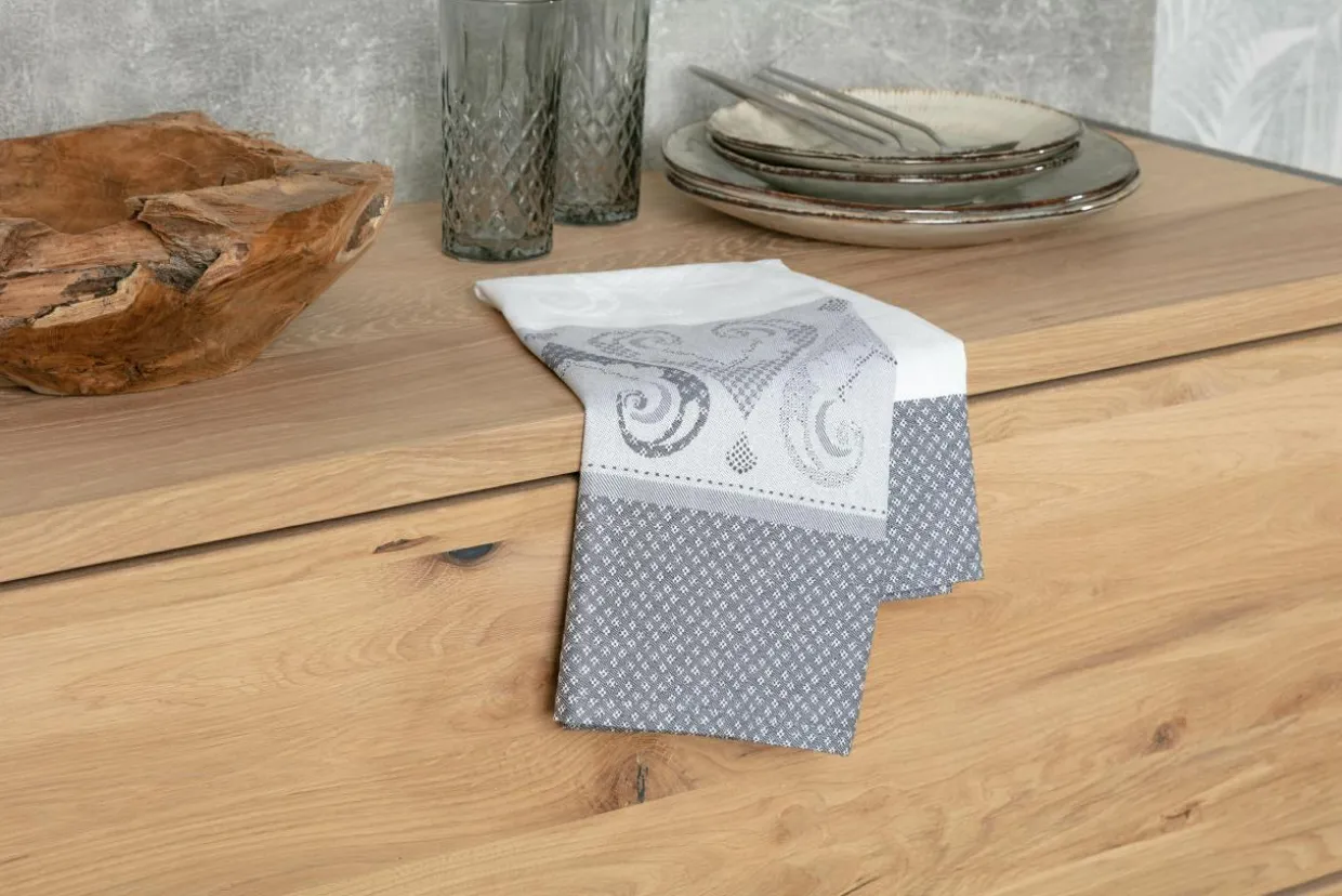 Estetyczne wykończenie i nowoczesny wzór sprawiają, że ręcznik będzie się prezentować bardzo elegancko na tle zwykle stonowanych kuchennych mebli.
