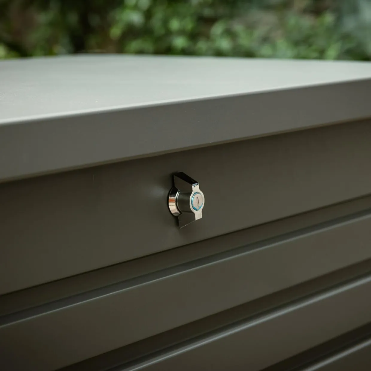 - Skrzynia posiada zamek na klucz, dzięki czemu dodatkowo zabezpieczy przedmioty przed dziećmi i zwierzętami.