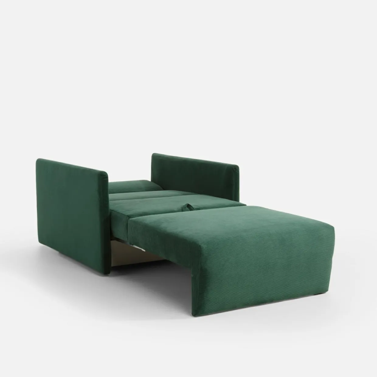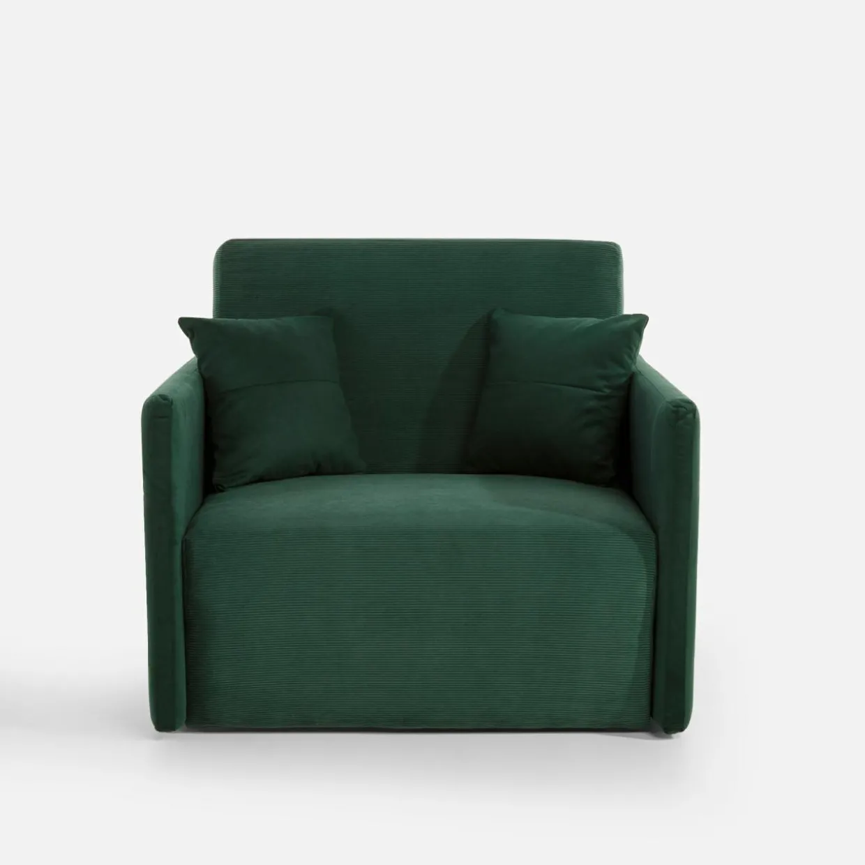 Sofa MIKA w zielonym butelkowym odcieniu to kompaktowy mebel, który doskonale sprawdzi się w kawalerce, pełniąc funkcję fotela i dodatkowego miejsca do spania dla gości.