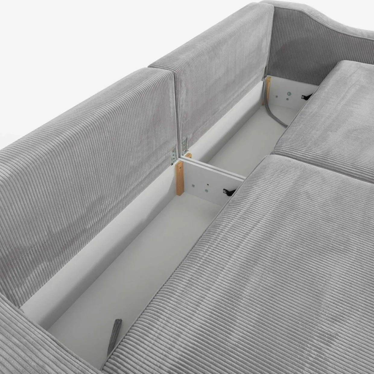 Pod siedziskiem znajdują się 2 pojemniki na pościel, koce czy poduszki.
