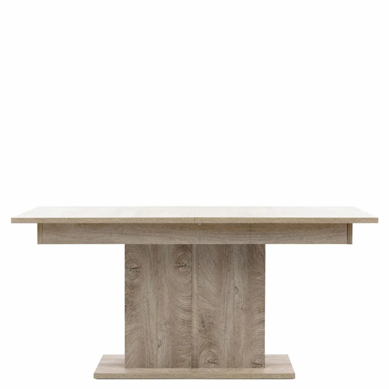 - Korpus, blat oraz kolumnowa podstawa stołu są wykonane z płyty meblowej pokrytej laminatem w kolorze dębu.