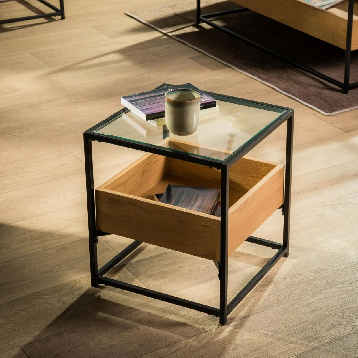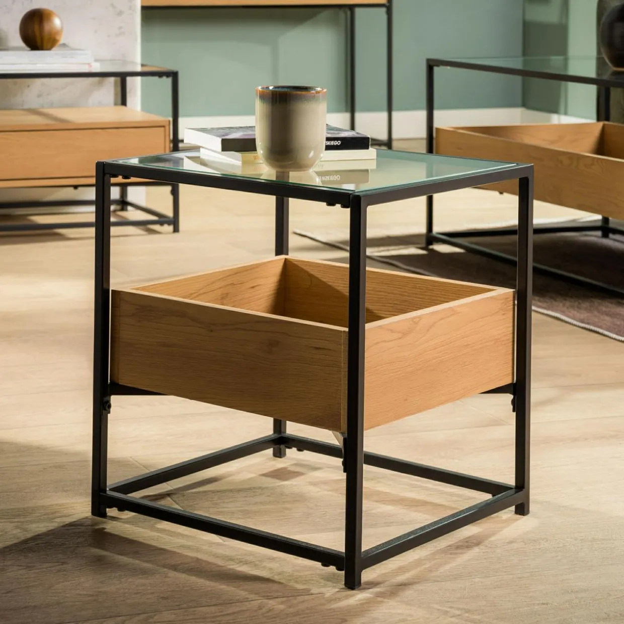 Rama ze stali malowanej proszkowo tworzy stabilną podporę dla półki oraz delikatnego blatu.