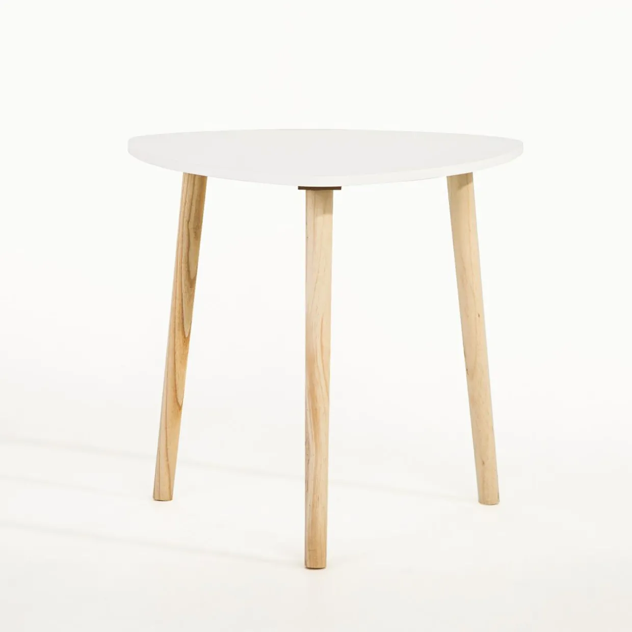 Nogi zostały wykonane z naturalnego drewna sosnowego. W połączeniu z białym matowym blatem o trójkątnym kształcie prezentują się lekko i nowocześnie.