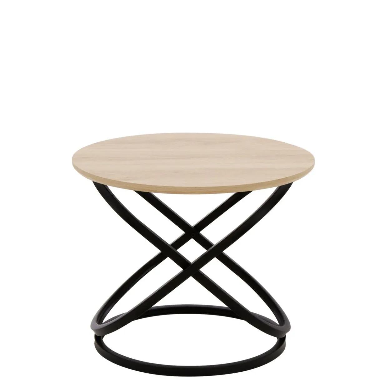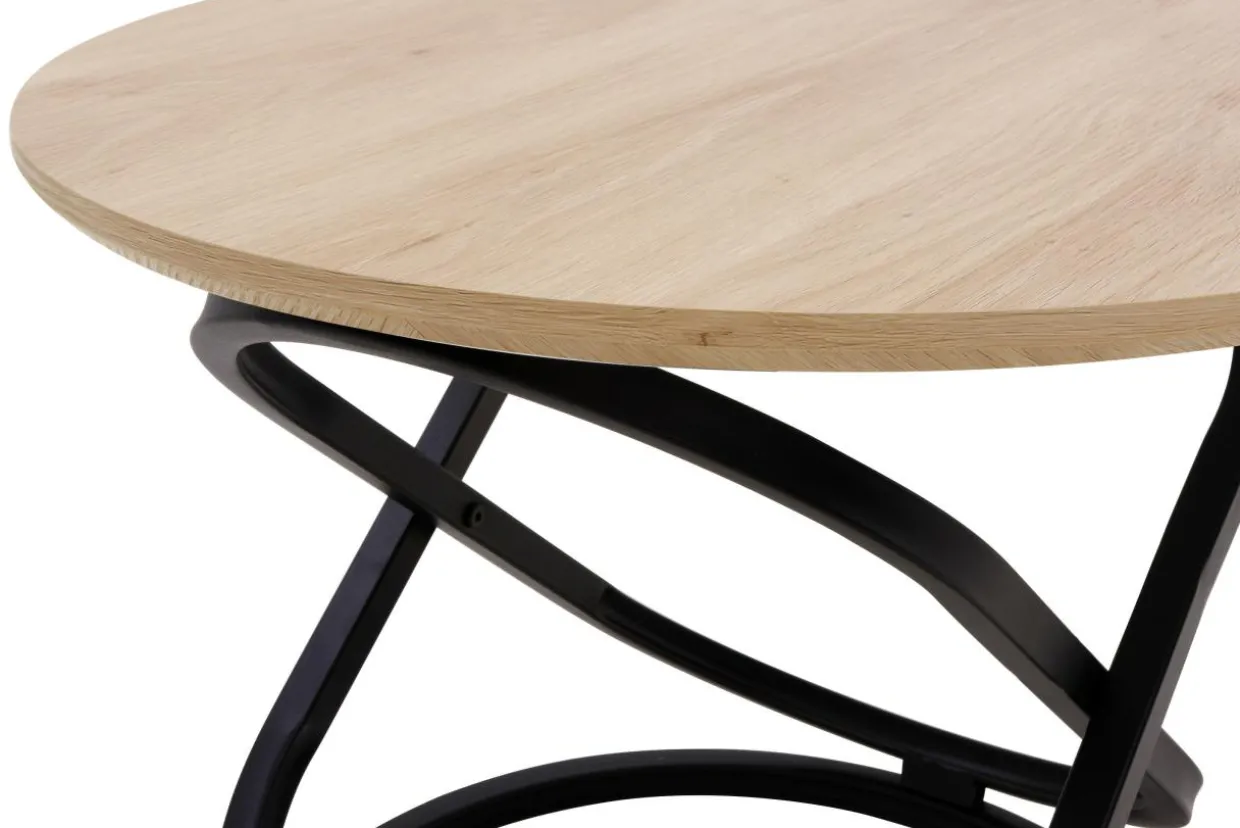- Metalowa podstawa stolika stanowi punkt podparcia dla okrągłego blatu z płyty MDF o grubości 18 mm z drewnopodobną okleiną utrzymaną w kolorystyce dębu.