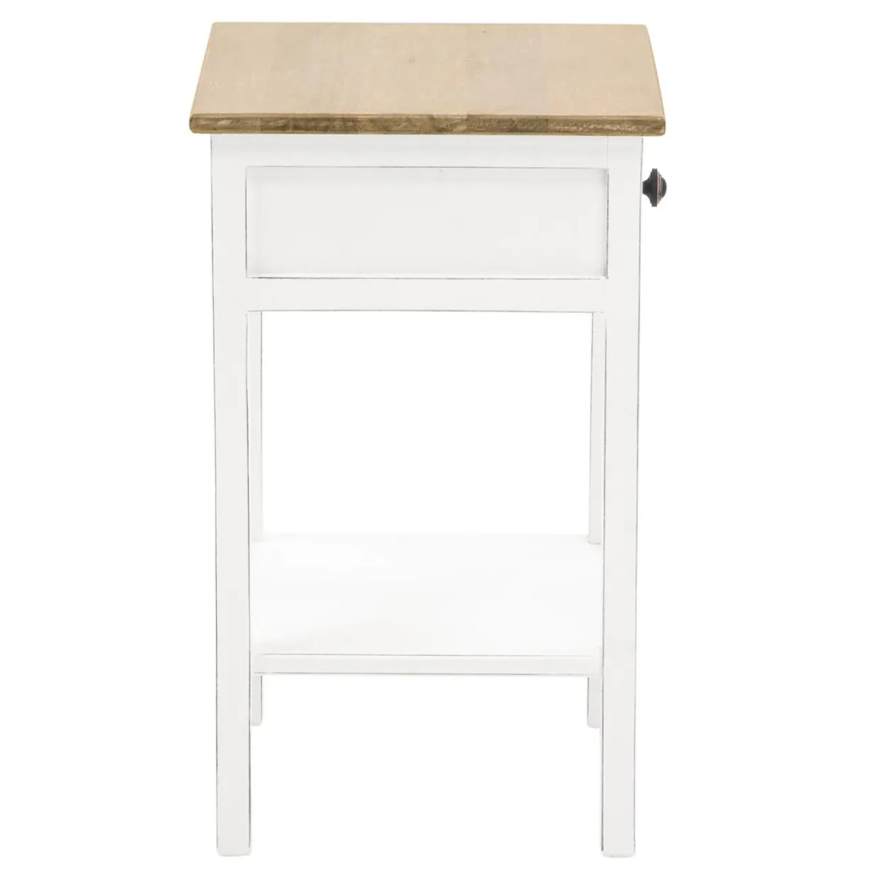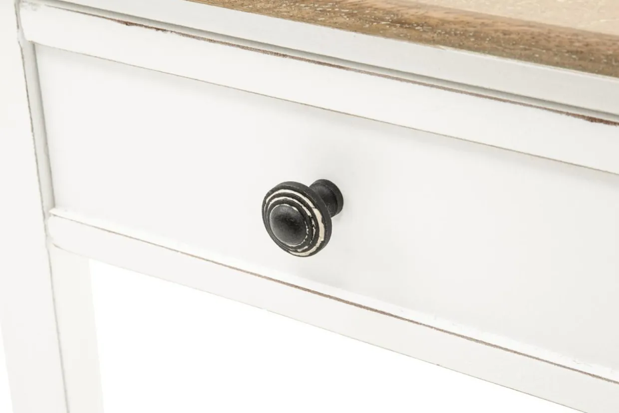 - Stolik wykonano z drewna mango i zabezpieczono białym lakierem z efektem matu. Przecierania sprawiają, że mebel wygląda na postarzany.