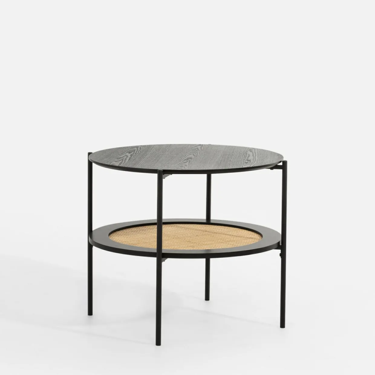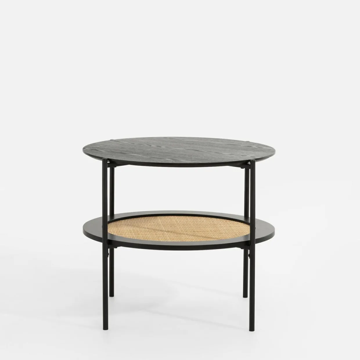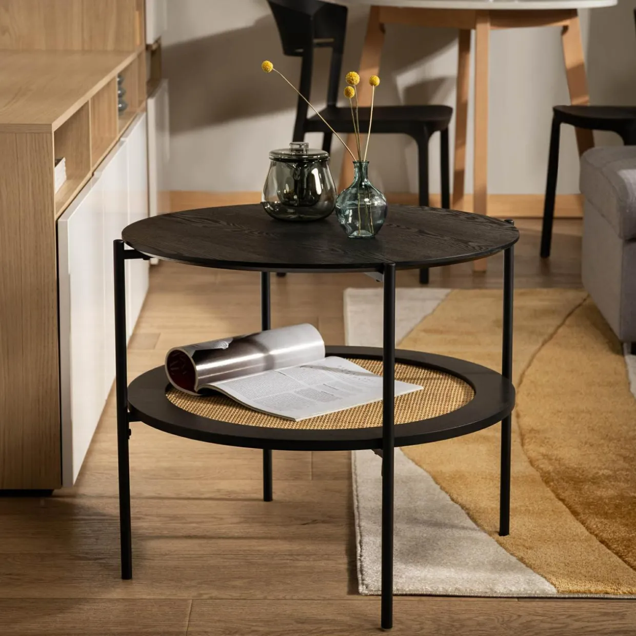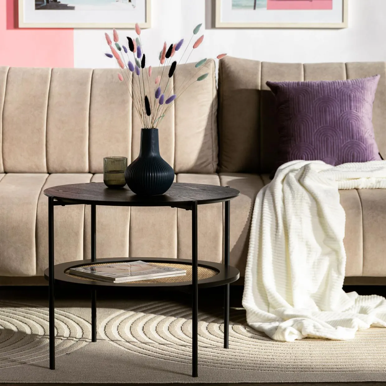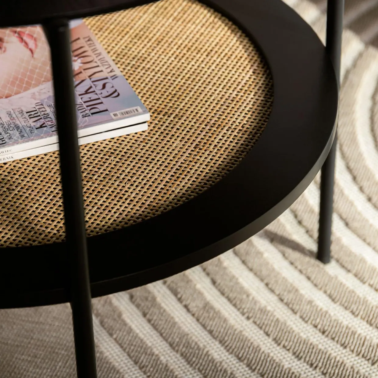- Czarne blaty i metalowe nogi zostały połączone z półką wykonaną z naturalnego jasnego rattanu – ten intrygujący kontrast dodaje głębi i wyrazistości.