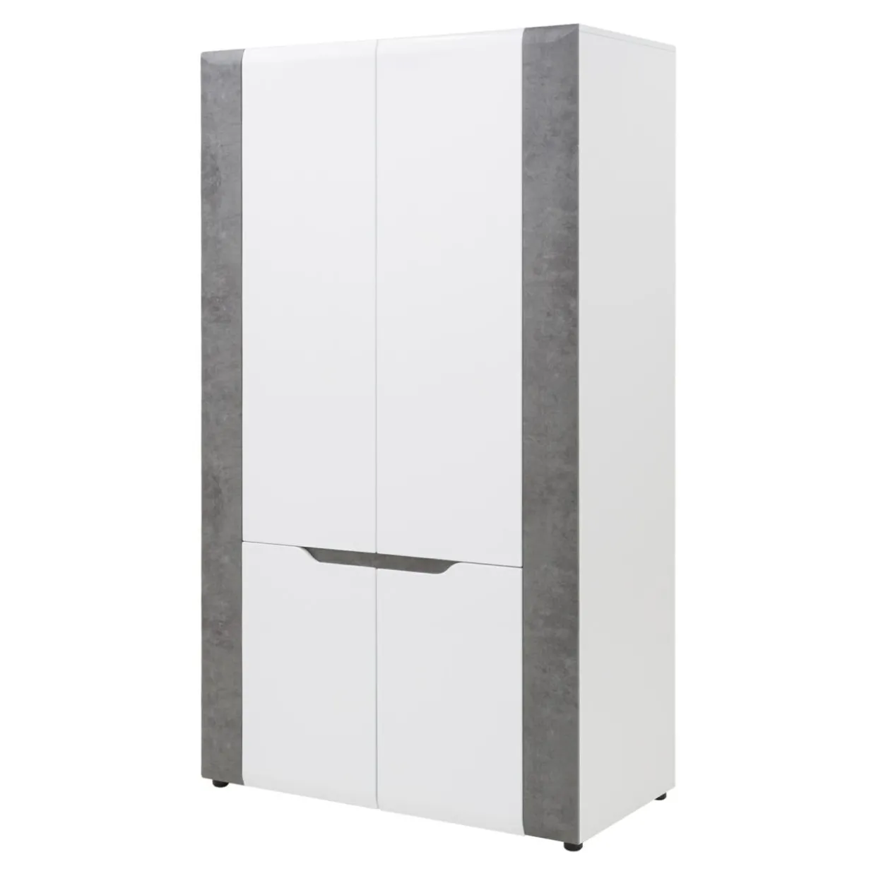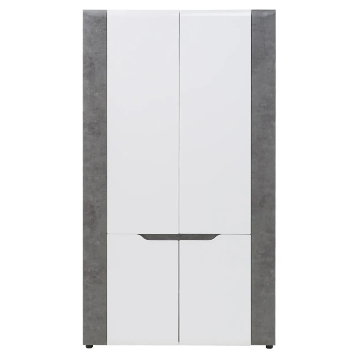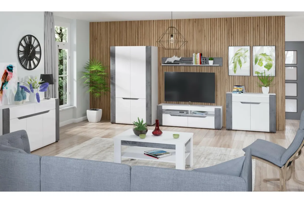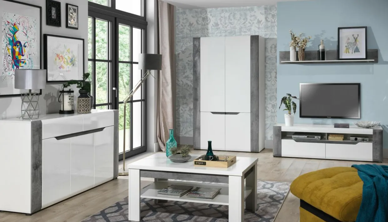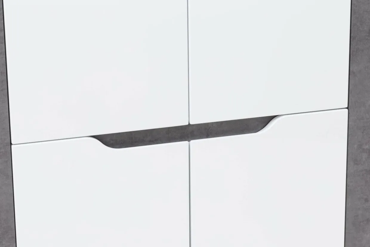 Korpus oraz blaty mebla zostały wykonane z laminowanej płyty meblowej, natomiast fronty to MDF z wykończeniem w białym połysku. Modne zestawienie bieli oraz szarości betonu dodaje szafie BRANDO nieco surowości złagodzonej poprzez linię podchwytów we frontowej części mebla.