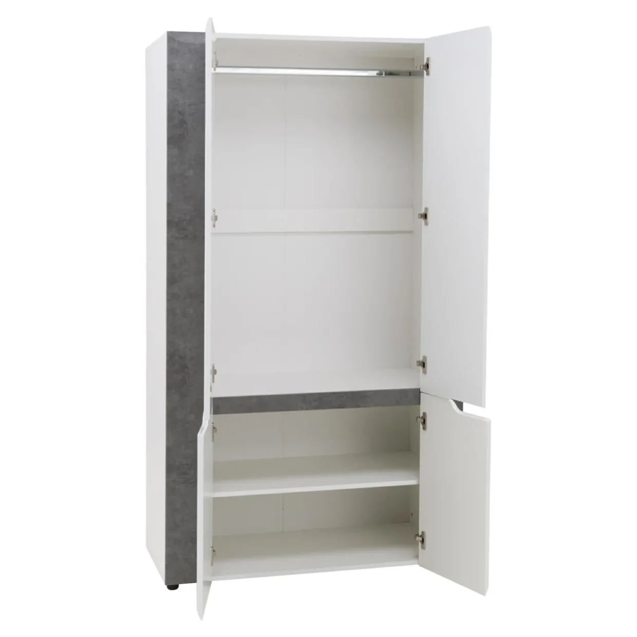 Tradycyjna budowa z otwieranymi drzwiami oraz wnętrzem wyposażonym w drążek (górna część) oraz półki (część dolna) pozwala zorganizować własną garderobę. Jednocześnie mebel nie zajmuje dużo miejsca i jest ustawny. W drzwiach szafy zostały zainstalowane zawiasy z systemem cichego domyku.