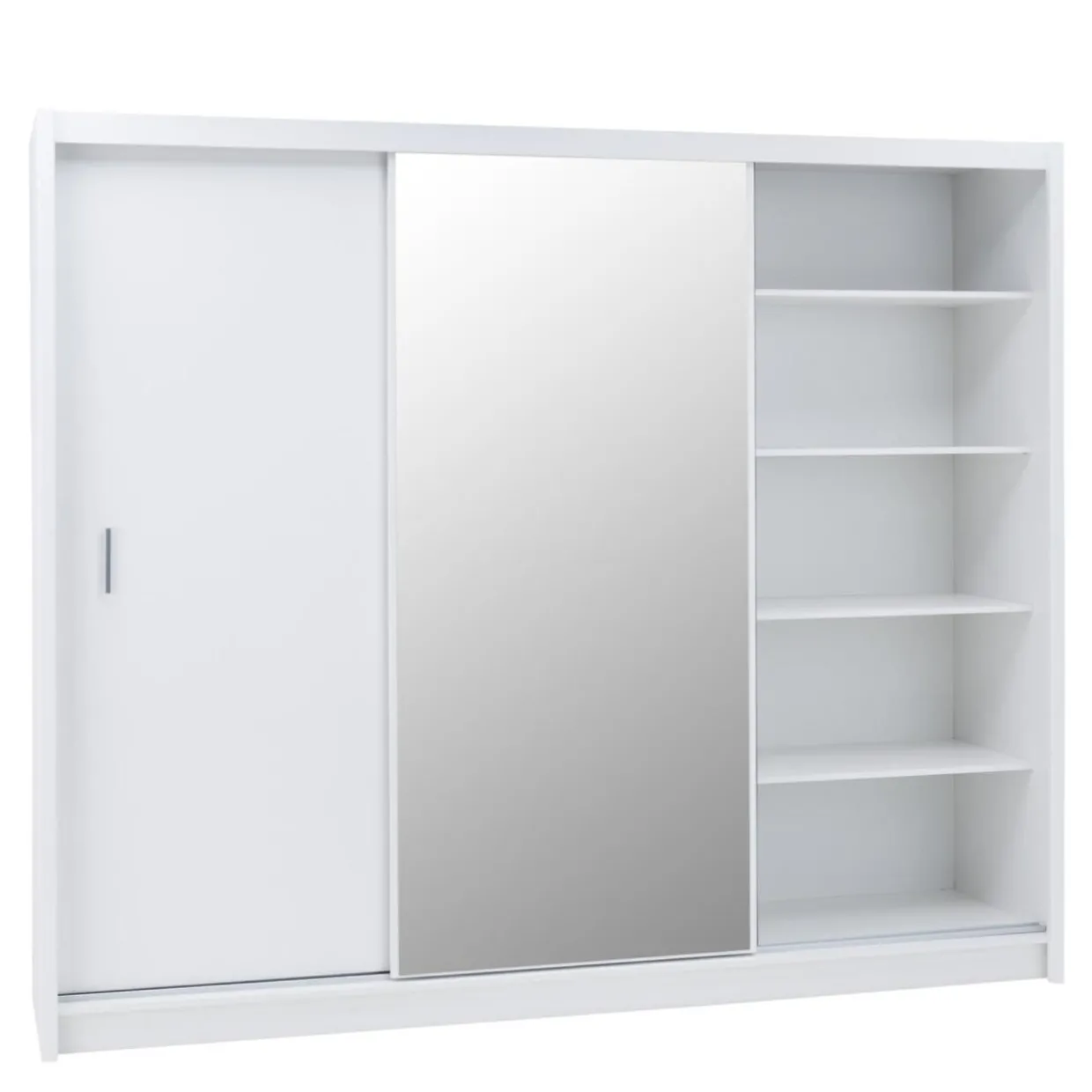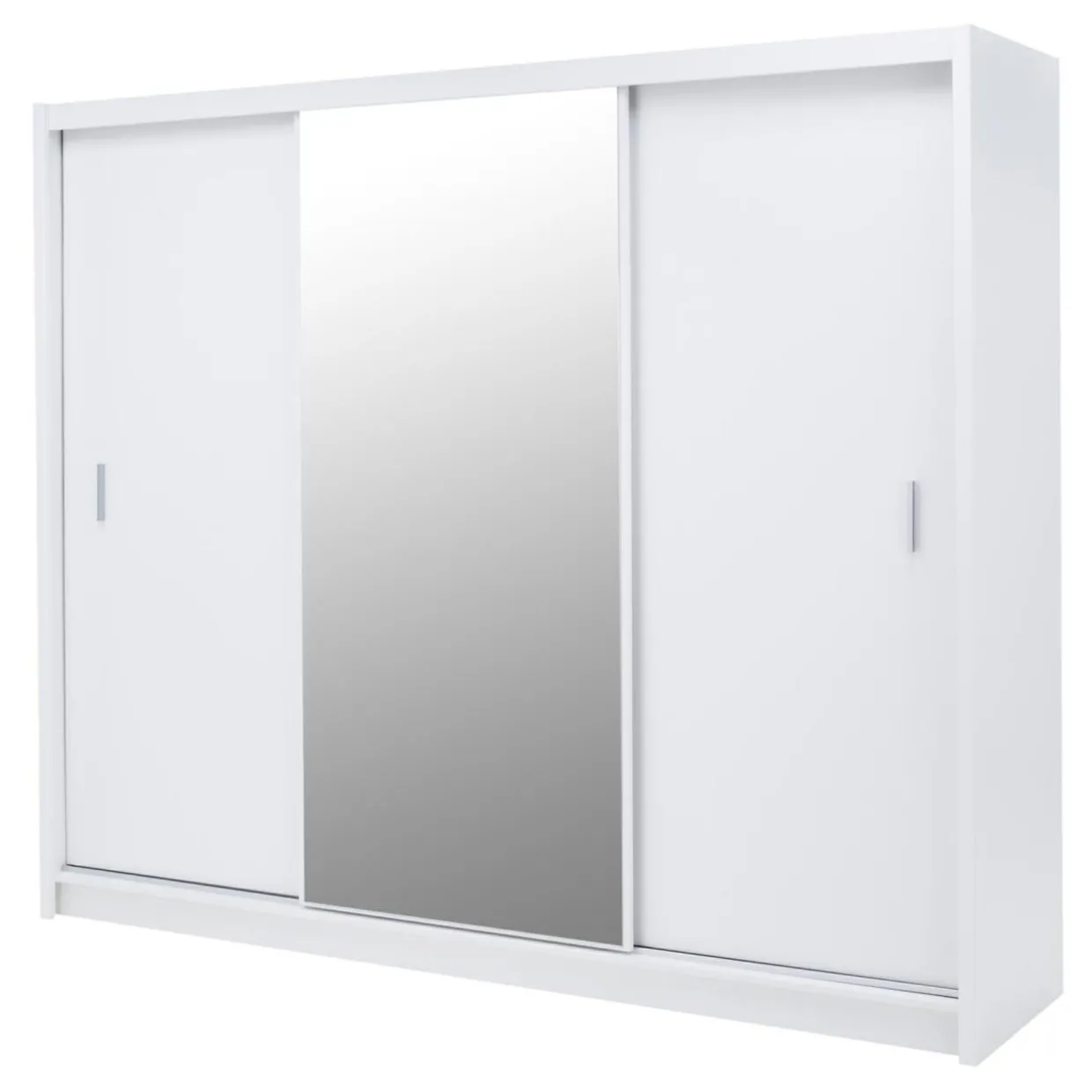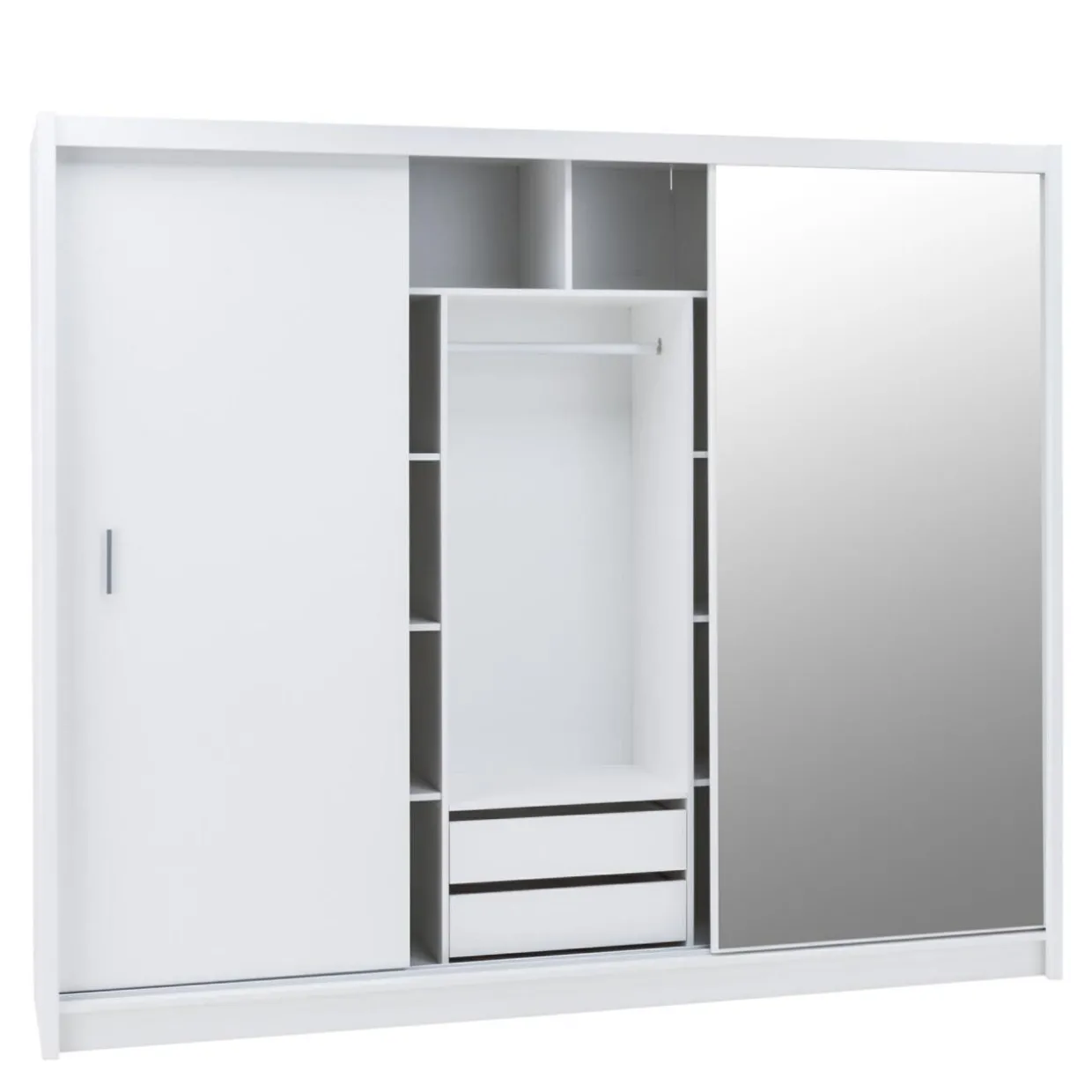 Szafa DAVOS posiada przesuwane drzwi z poręcznymi, pionowo umieszczonymi uchwytami. Centralną ich część zajmuje lustro w neutralnym srebrnym kolorze. Wymiary lustra – 1975×865 mm.