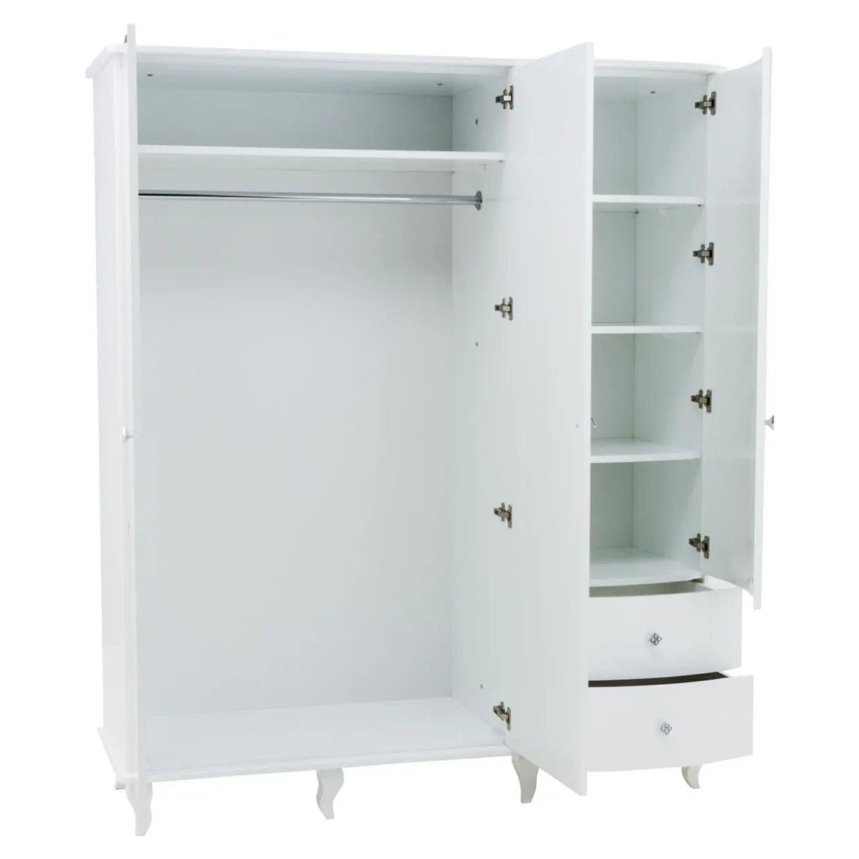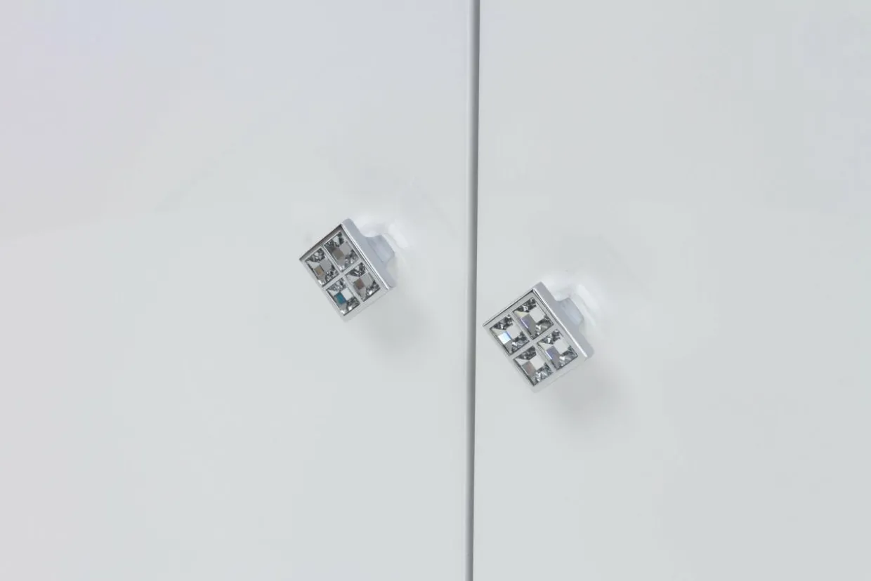 Szafa została wykończona białym lakierem w wysokim połysku, ozdobne nóżki są wykonane z litego drewna, uchwyty są zdobione kryształkami.