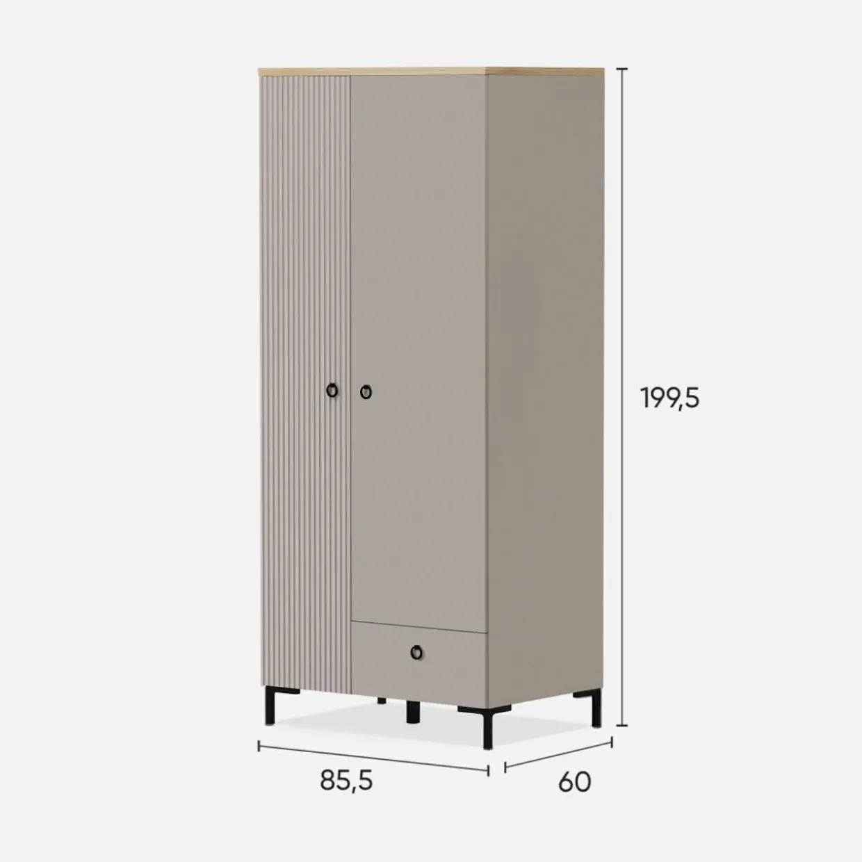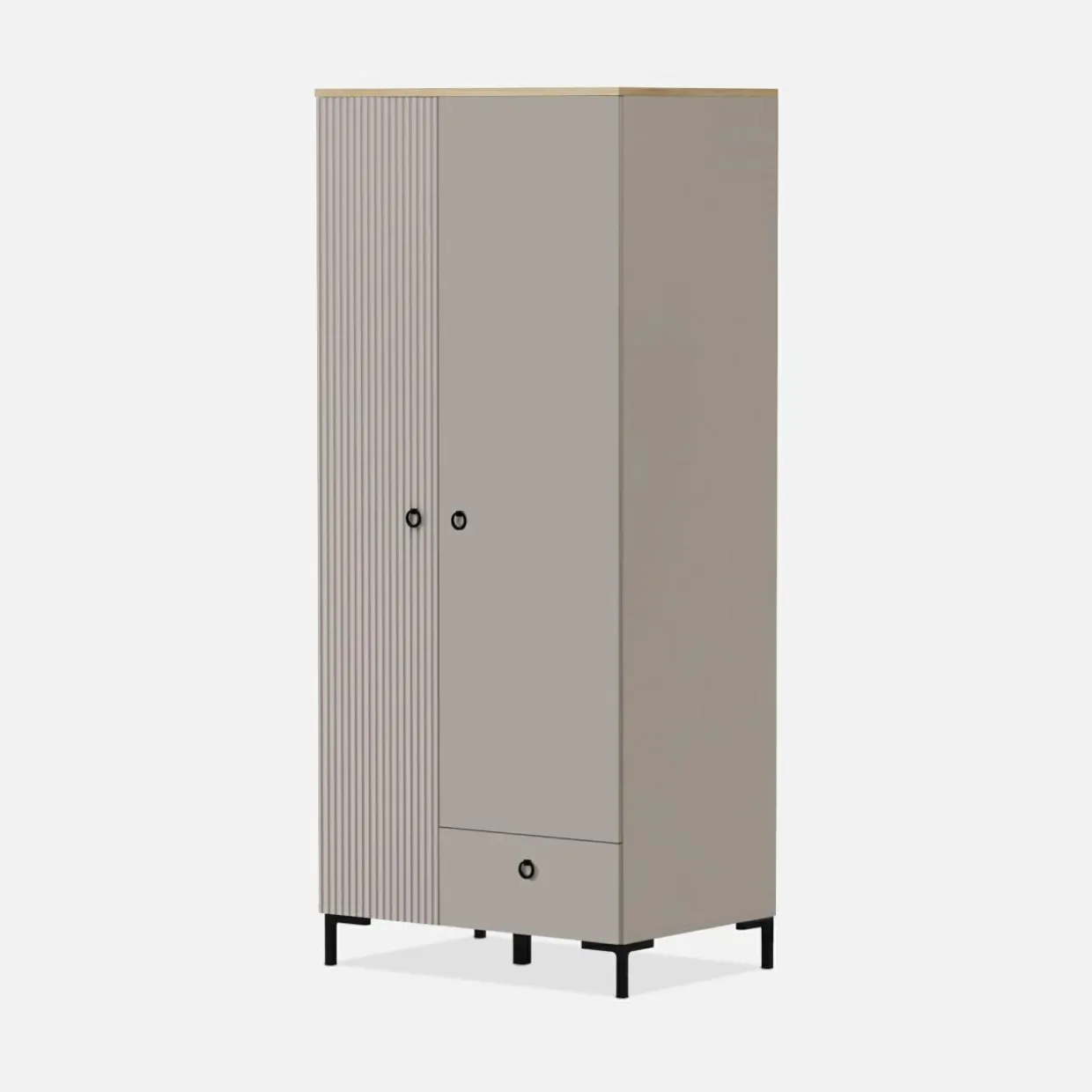 - Ryflowane fronty w kolorze taupe idealnie zgrywają się z korpusami. Wykończone są laminatem i folią.