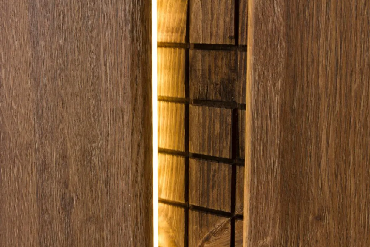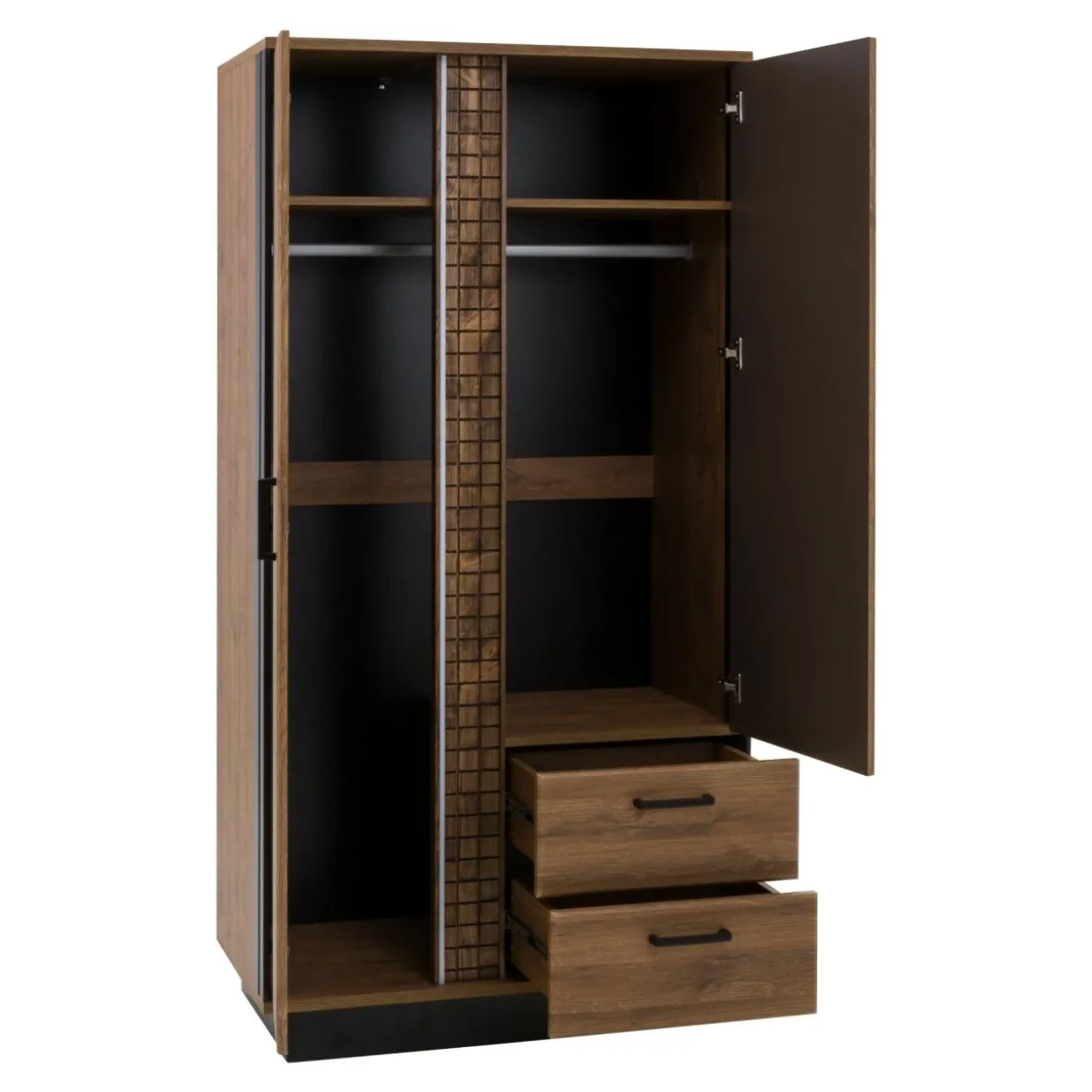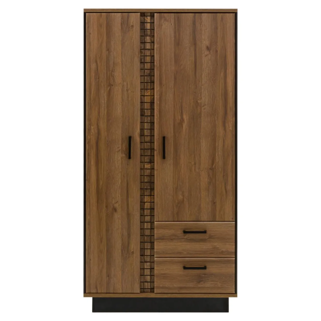 Od strony wizualnej uwagę zwraca jasna kolorystyka mebla w odcieniu dąb april, która została wzbogacona czarnymi wstawkami. Zamiast nóżek w szafie DORIAN zastosowano ozdobny cokół – również utrzymany w czarnym kolorze.