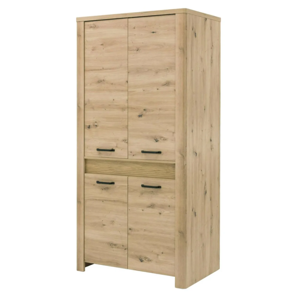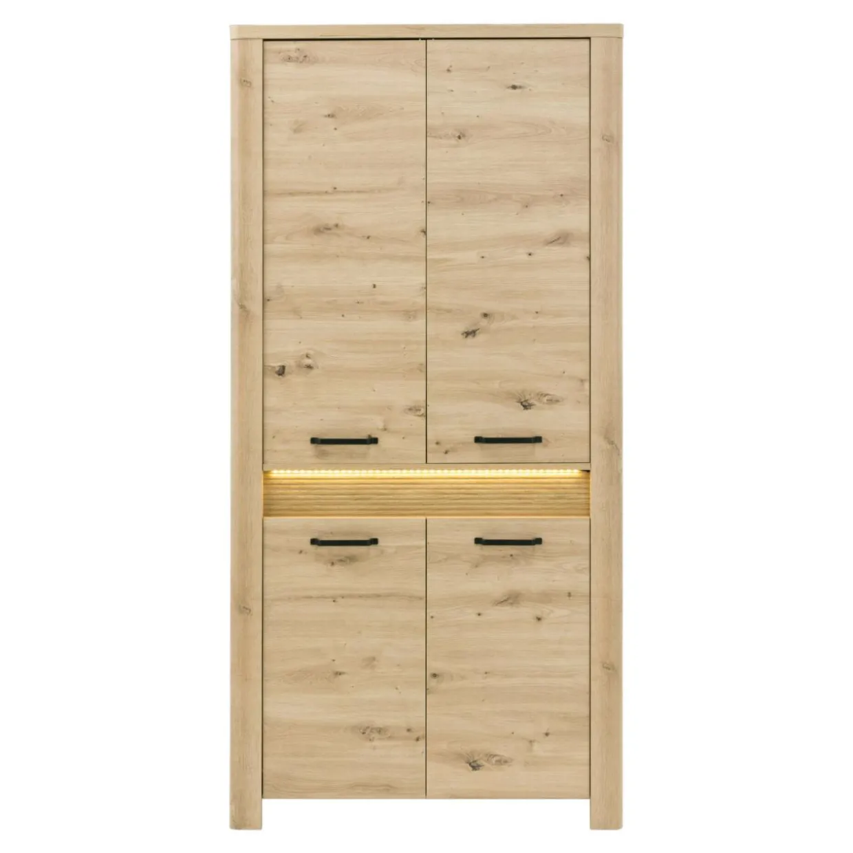 Szafa MORIS została wykonana z płyty meblowej, wykończonej laminatem..Posiada oświetlenie LED umieszczone przy ozdobnej części w połowie wysokości mebla.