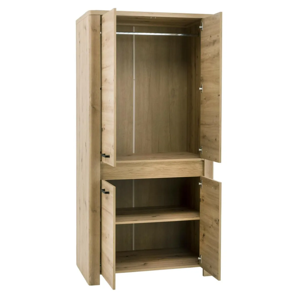 Szafa MORIS posiada przestronne wnętrze z podziałem na górną część, w której znajduje się drążek na ubrania. Dolna częśćmebla jest wyposazona w półkę.
