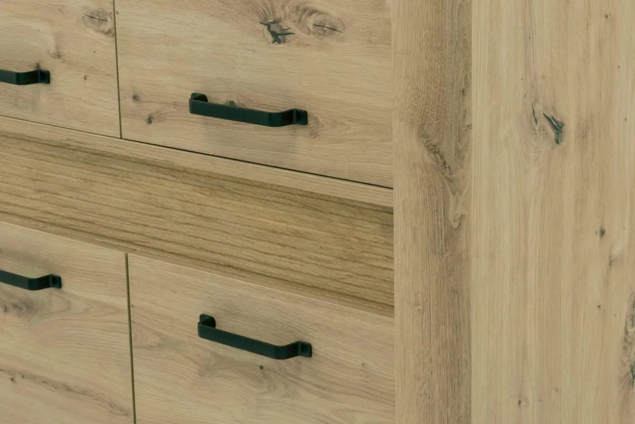 Kolorystyka dębu wzbogaca przestrzeń i wspaniale prezentuje się we wnętrzach lubiących światło. Proste, oszczędne wzornictwo brył kolekcji MORIS pozwala na dużą dowolność pod kątem indywidualnych rozwiązań przy wyborze wystroju wnętrza.