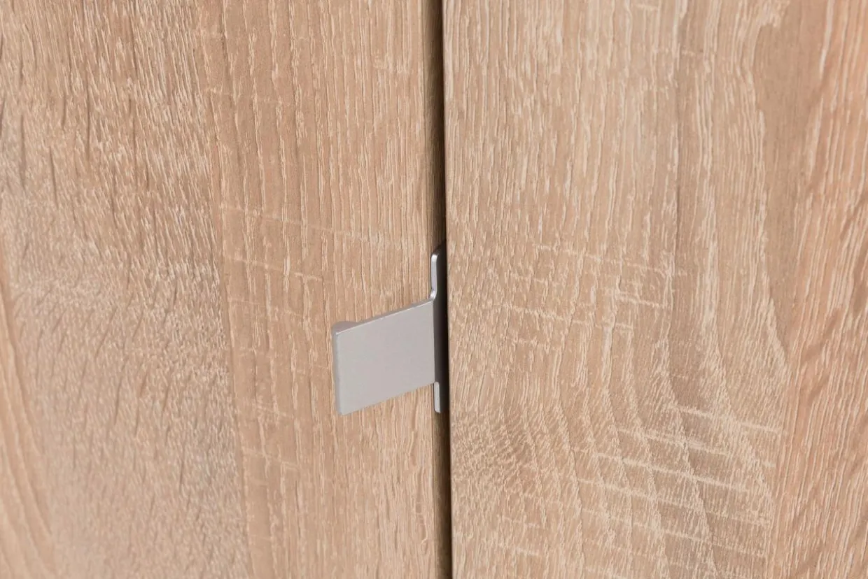Laminat w jasnym kolorze dębu sonoma dekorem przypominający drewno wprowadza w pomieszczeniu przytulny klimat, a brak tradycyjnych uchwytów sprawia, że mebel łatwiej wkomponować w dowolną aranżację.