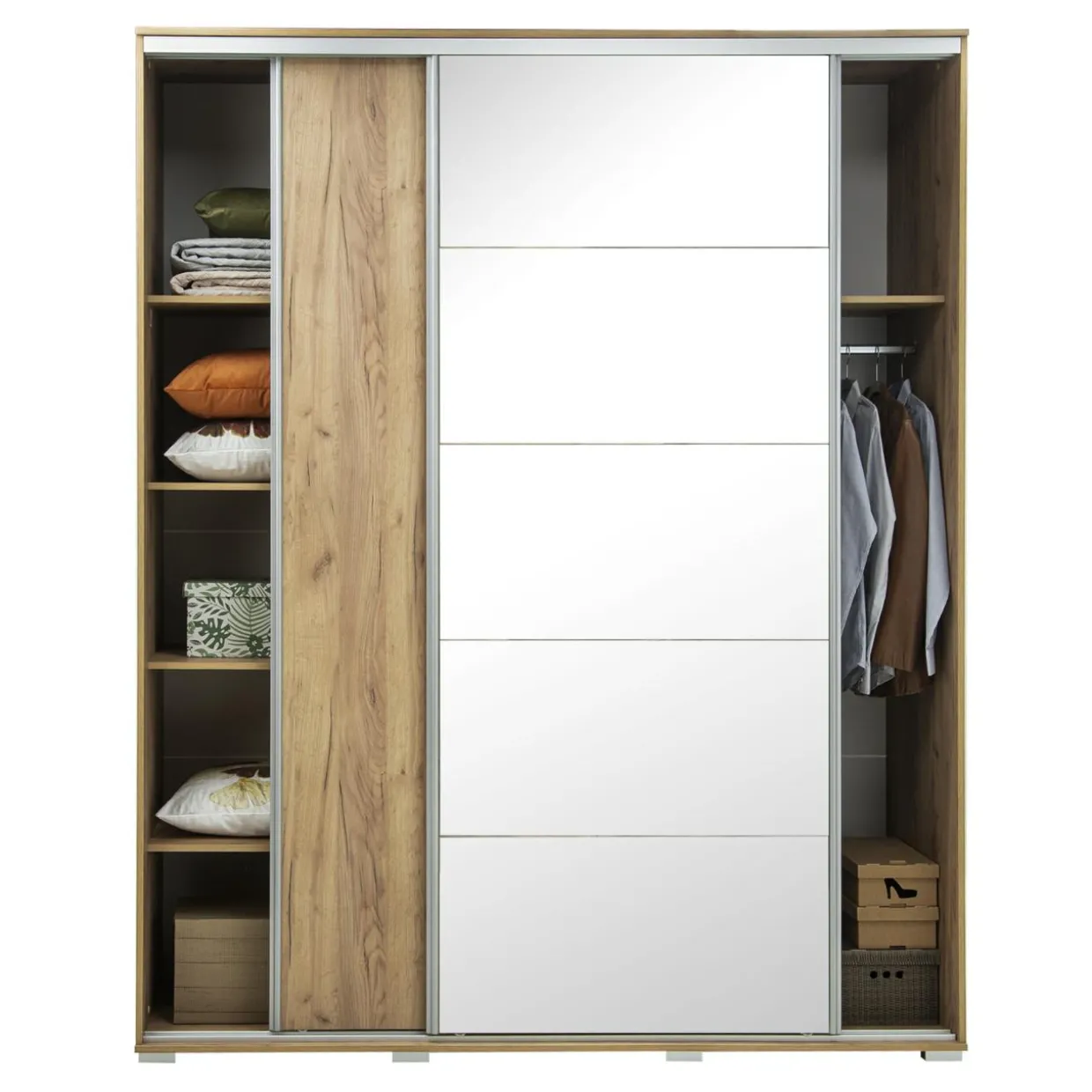 - Przesuwne drzwi: z łatwością skorzystasz z szafy w wąskim przedpokoju lub niewielkiej sypialni.