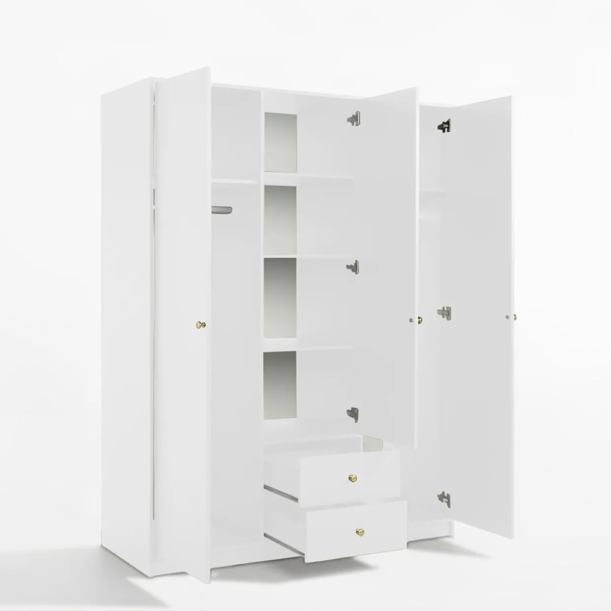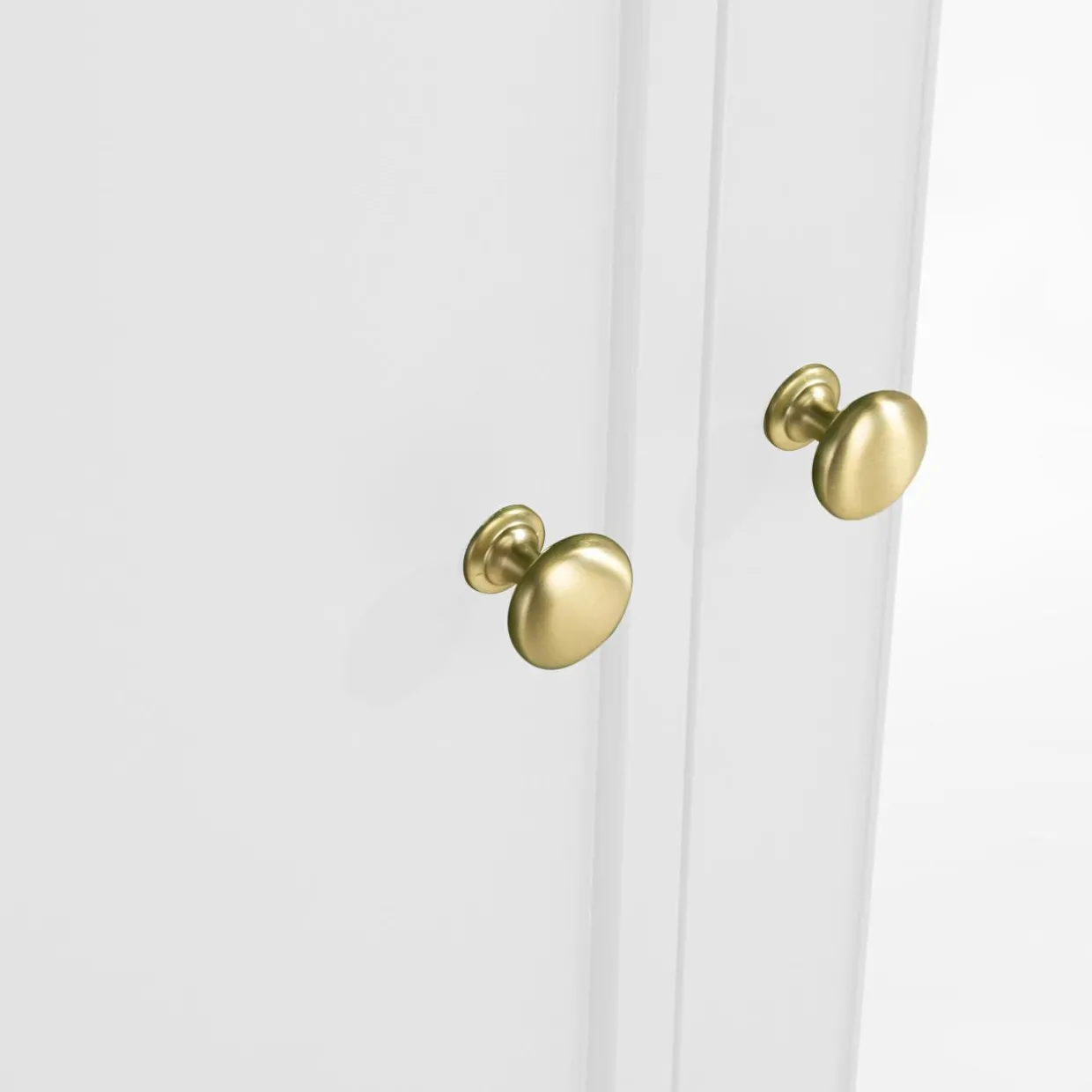 Złote metalowe uchwyty dodają elegancji i wyróżnią się na tle białych frontów.