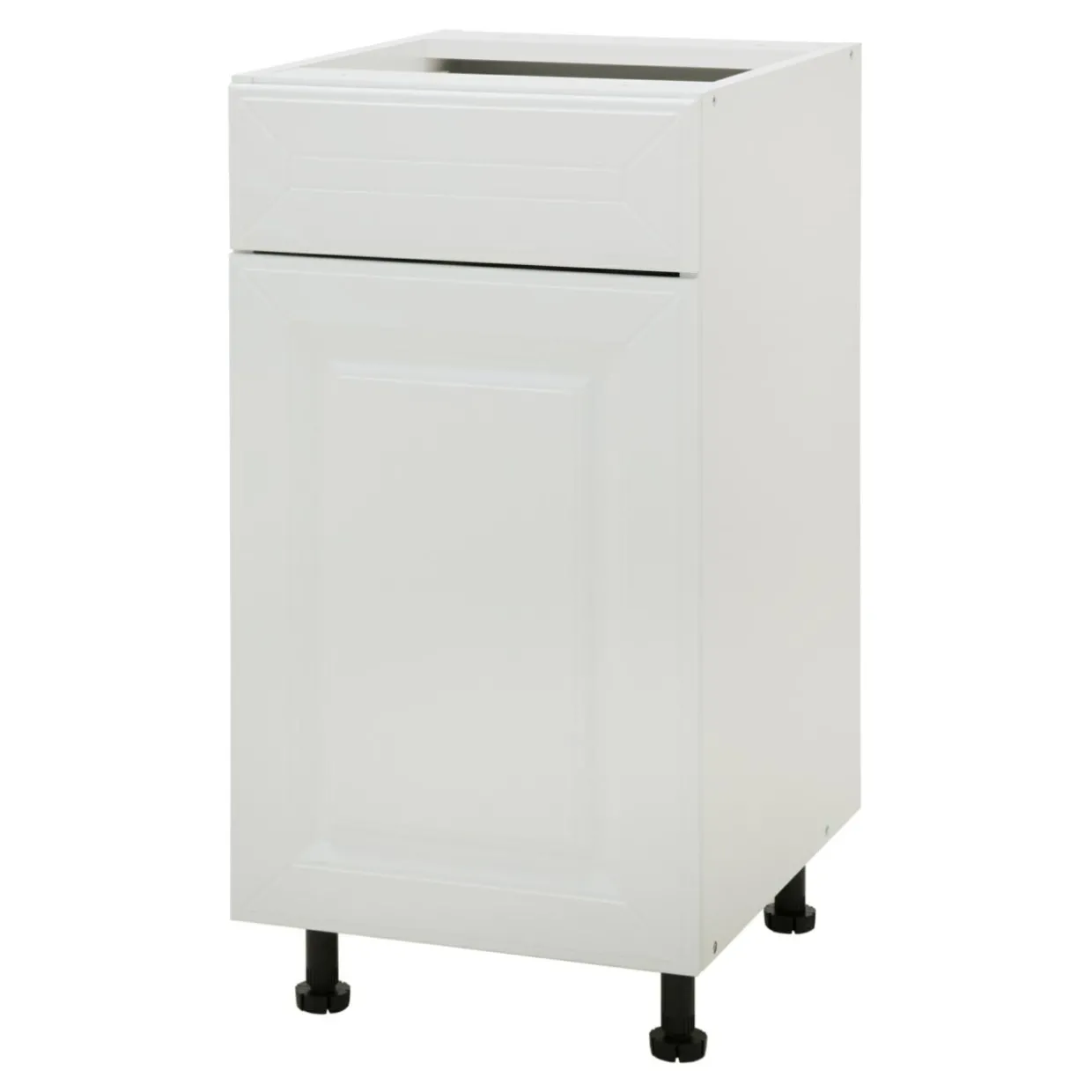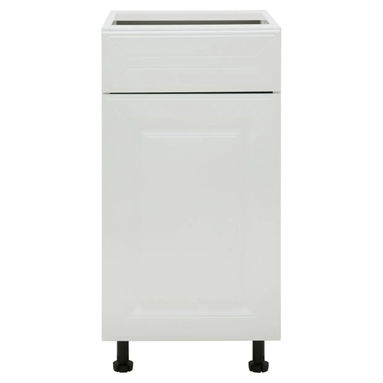 Front zamykanej szafki BASIC PLUS BP/D40S1 został wykończony w matowym odcieniu bieli. Uwagę zwraca charakterystyczna ramka, wewnątrz której umieszczone zostało zdobienie.