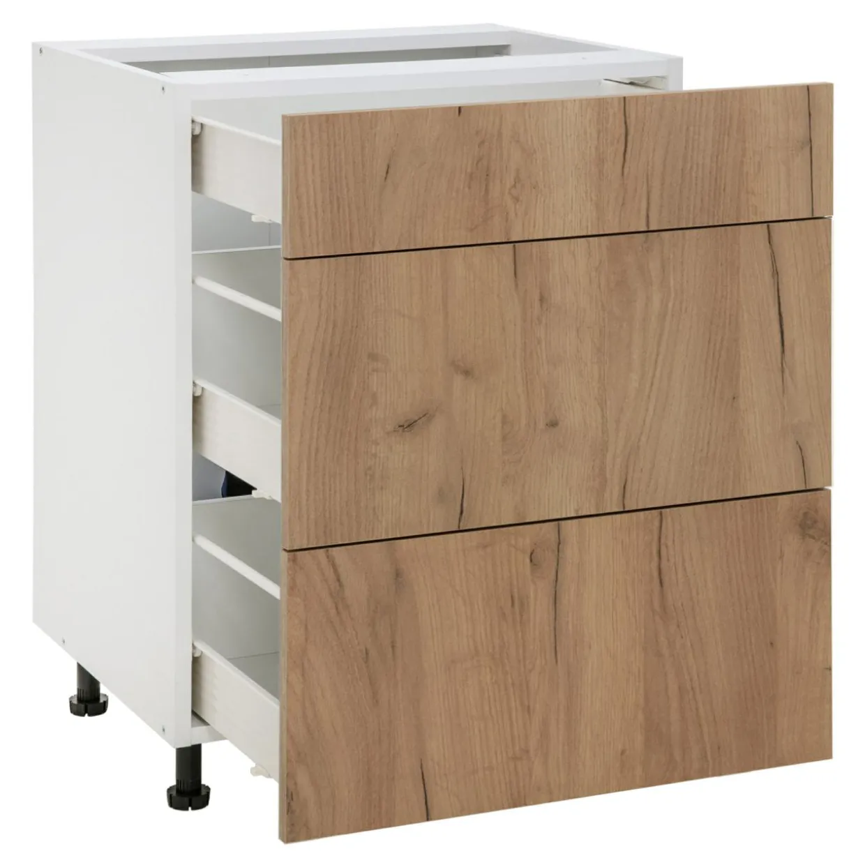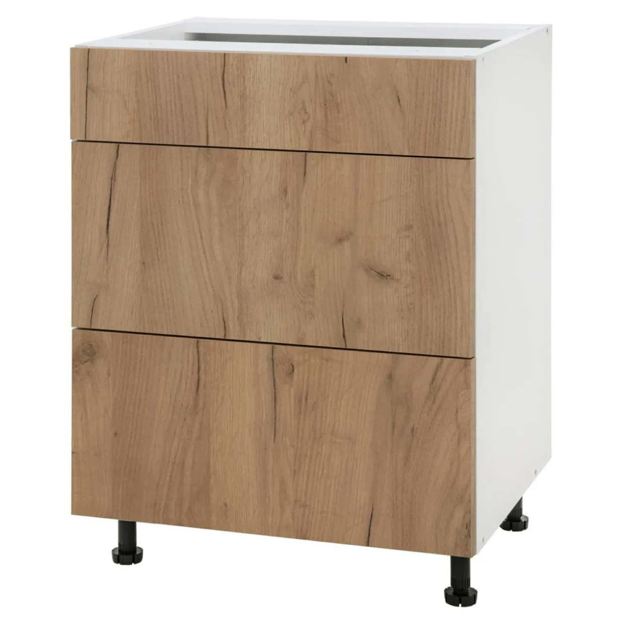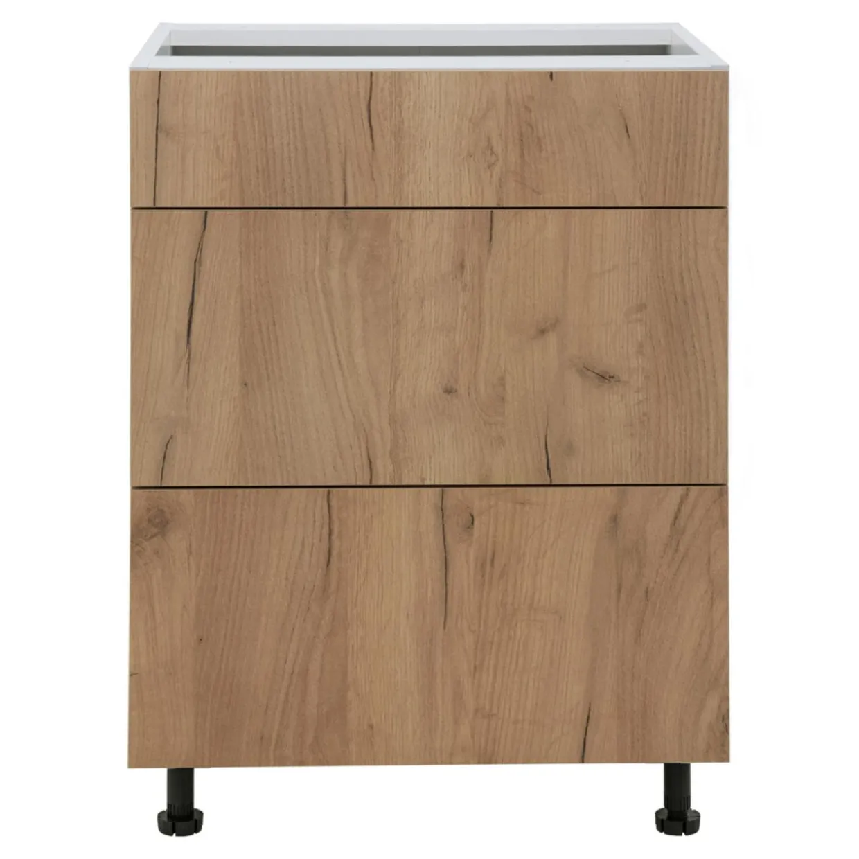 Wysoka na 82 cm szafka o szerokości 60 cm pozwala wygospodarować miejsce na naczynia, garnki oraz pomoce kuchenne, które dobrze mieć w zasięgu ręki podczas przyrządzania posiłku. Szafka posiada 3 szuflady. Najniższa z nich znajduje się bezpośrednio pod blatem, a dwie pozostałe posiadają standardowa wielkość.