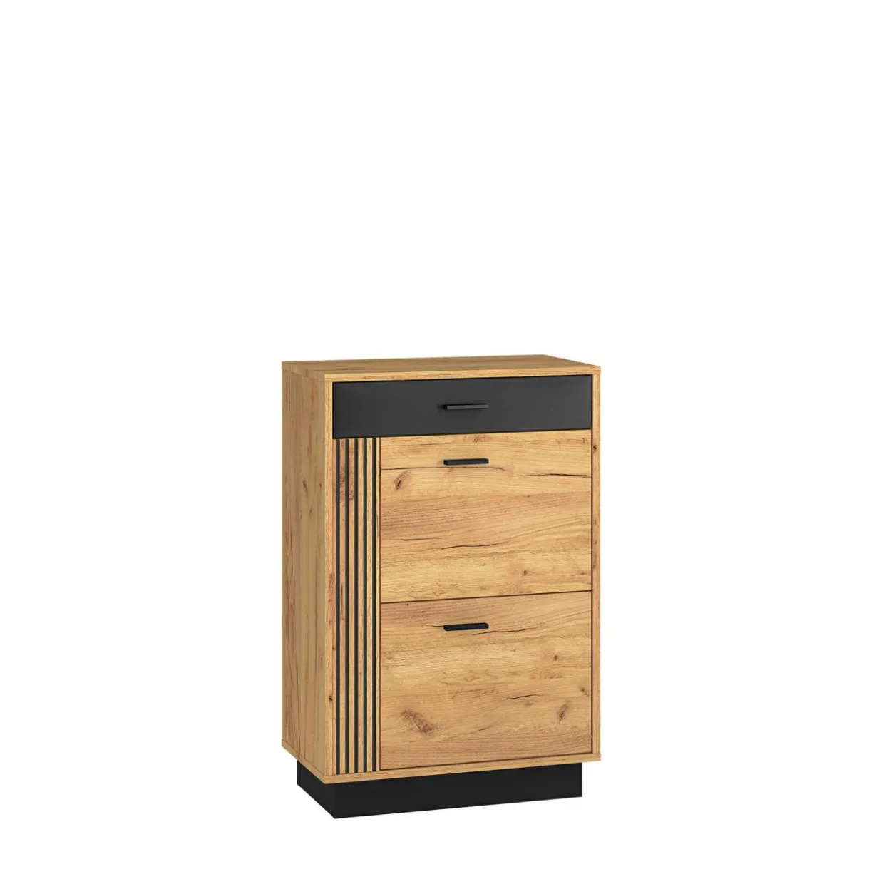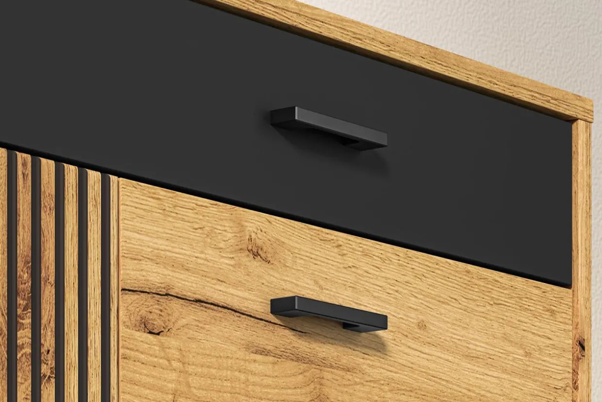 - Czarne elementy stanowią kontrast dla wybarwienia dębu craft złoty, podkreślając jego ciepły kolor.