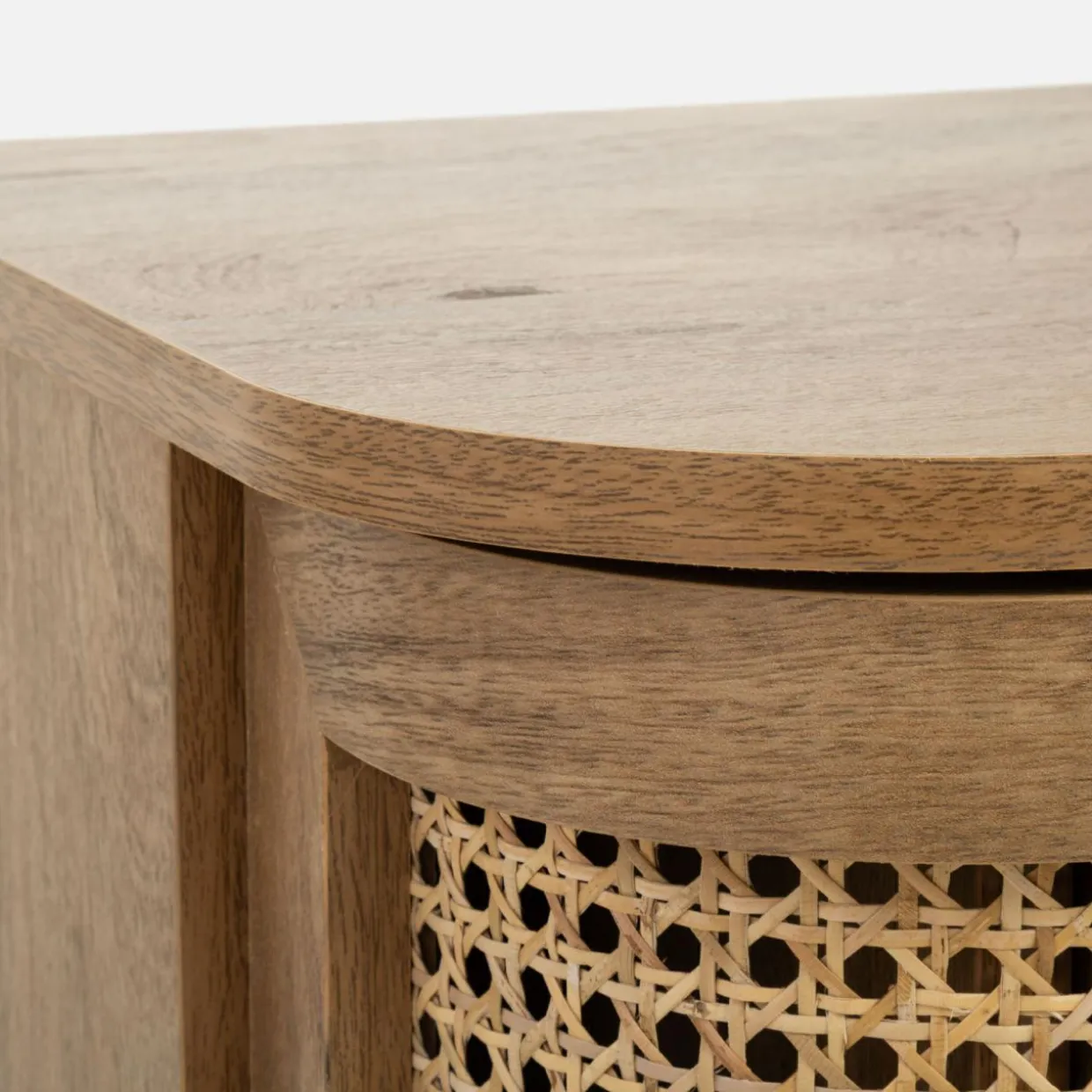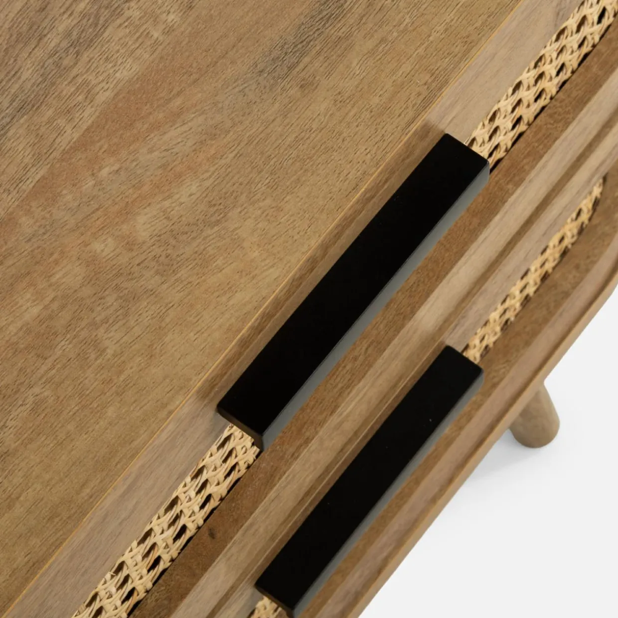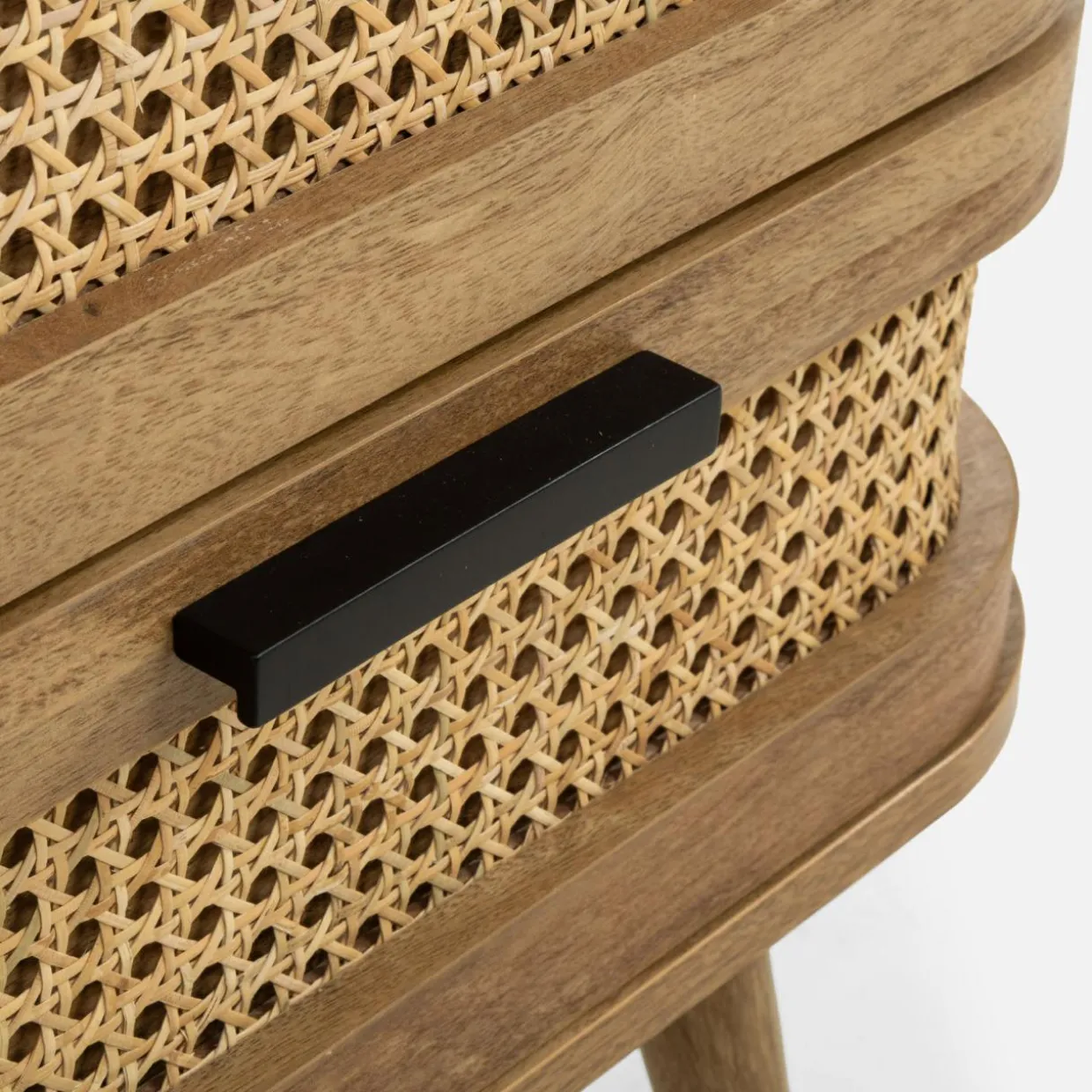 Szafka nocna FABLA w stylu boho łączy plecionkę wiedeńską z odcieniem mango wood, tworząc przytulną atmosferę w sypialni.