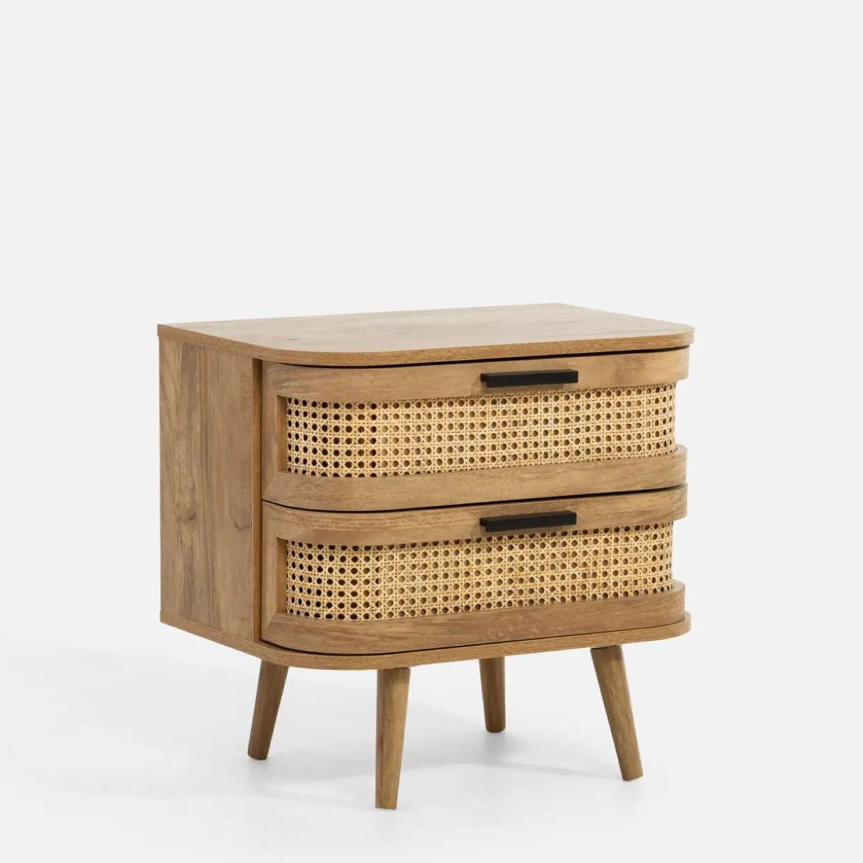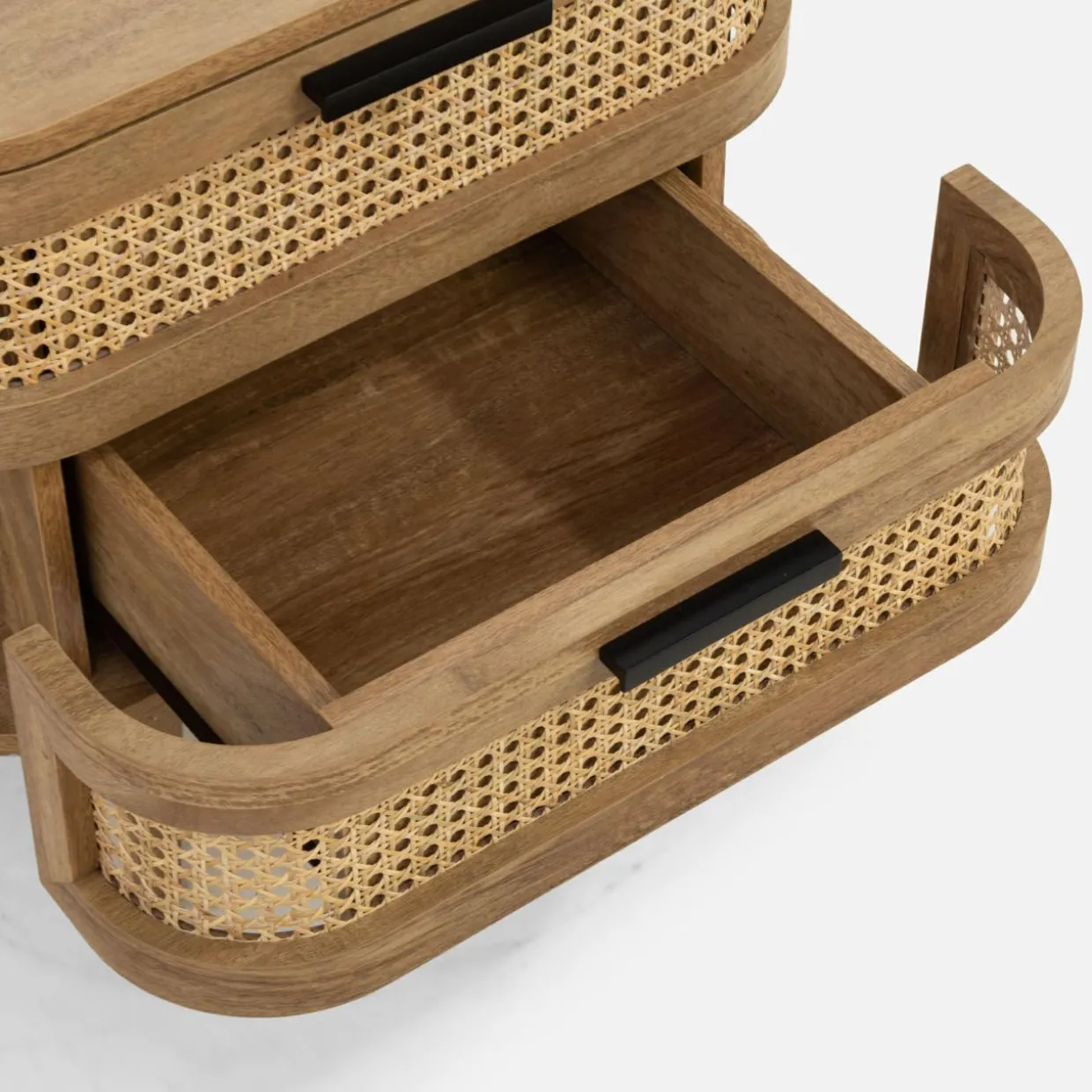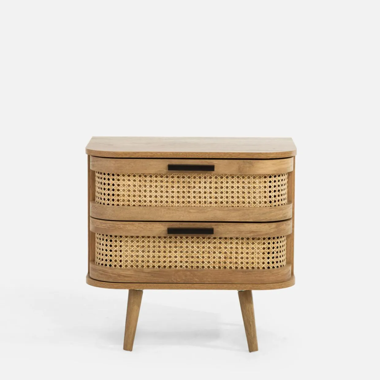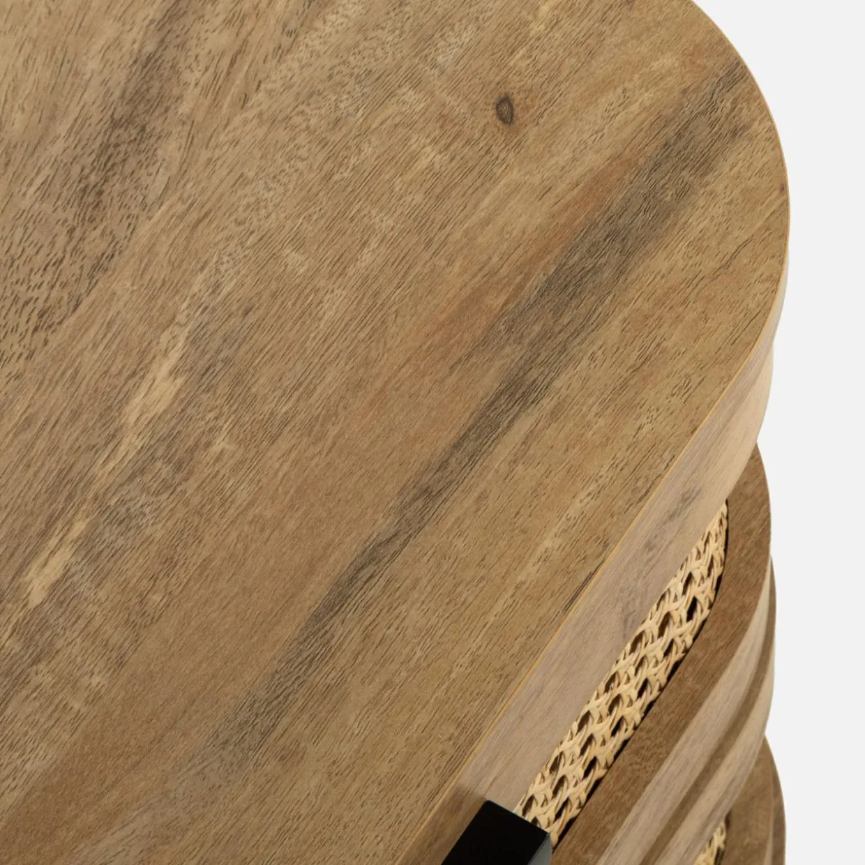 Szafka nocna FABLA w stylu boho łączy plecionkę wiedeńską z odcieniem mango wood, tworząc przytulną atmosferę w sypialni.