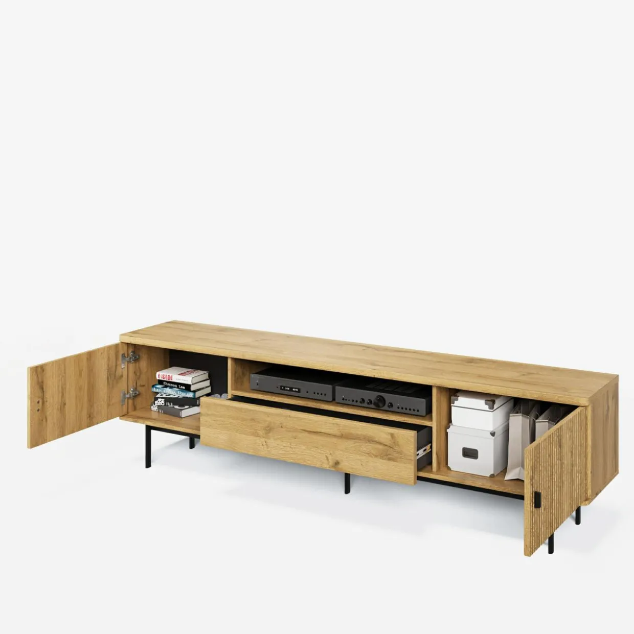 Odpręż się przy filmie lub programie telewizyjnym i nie martw się bałaganem. We wnękach szafki RTV LUCIA ułożysz potrzebne rzeczy i sprzęt multimedialny.