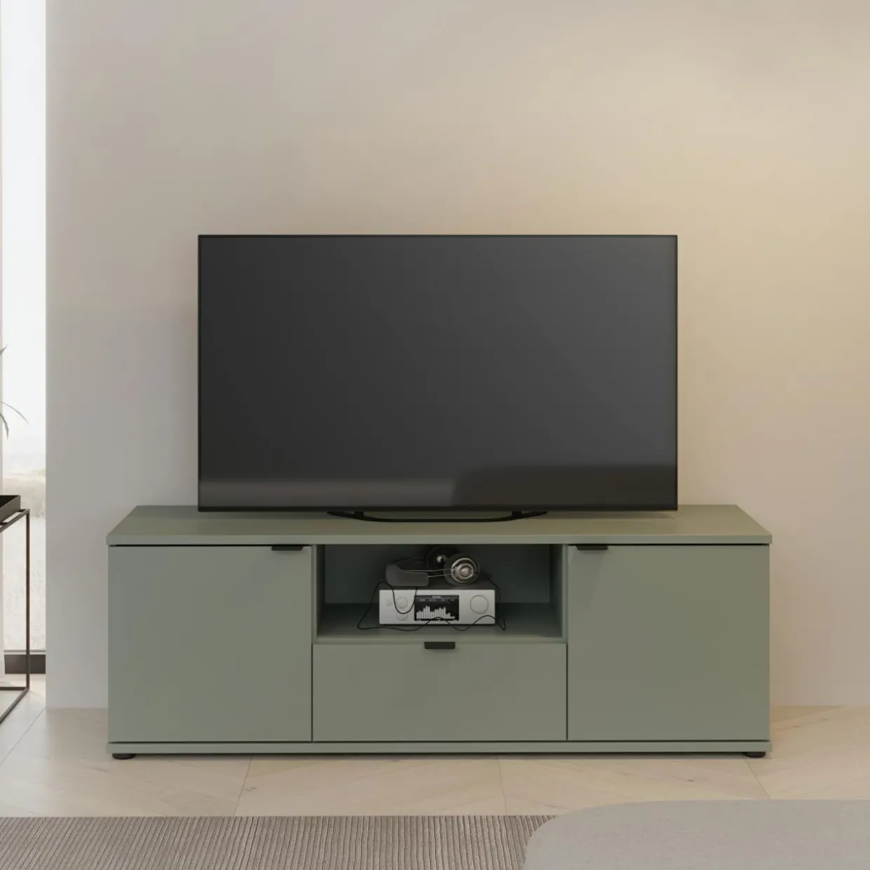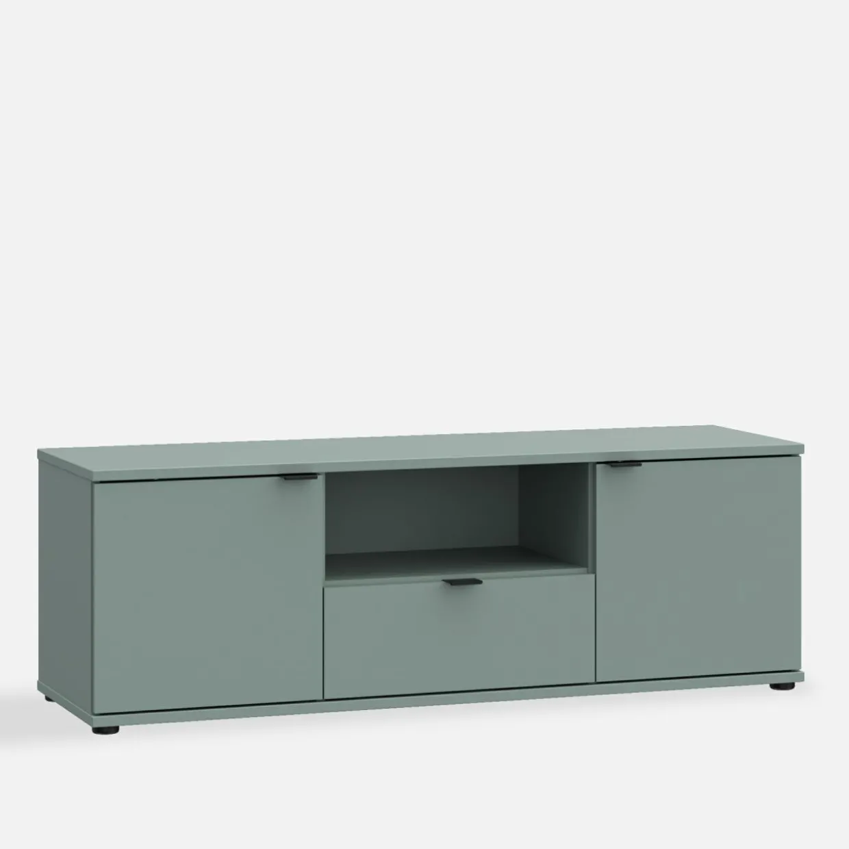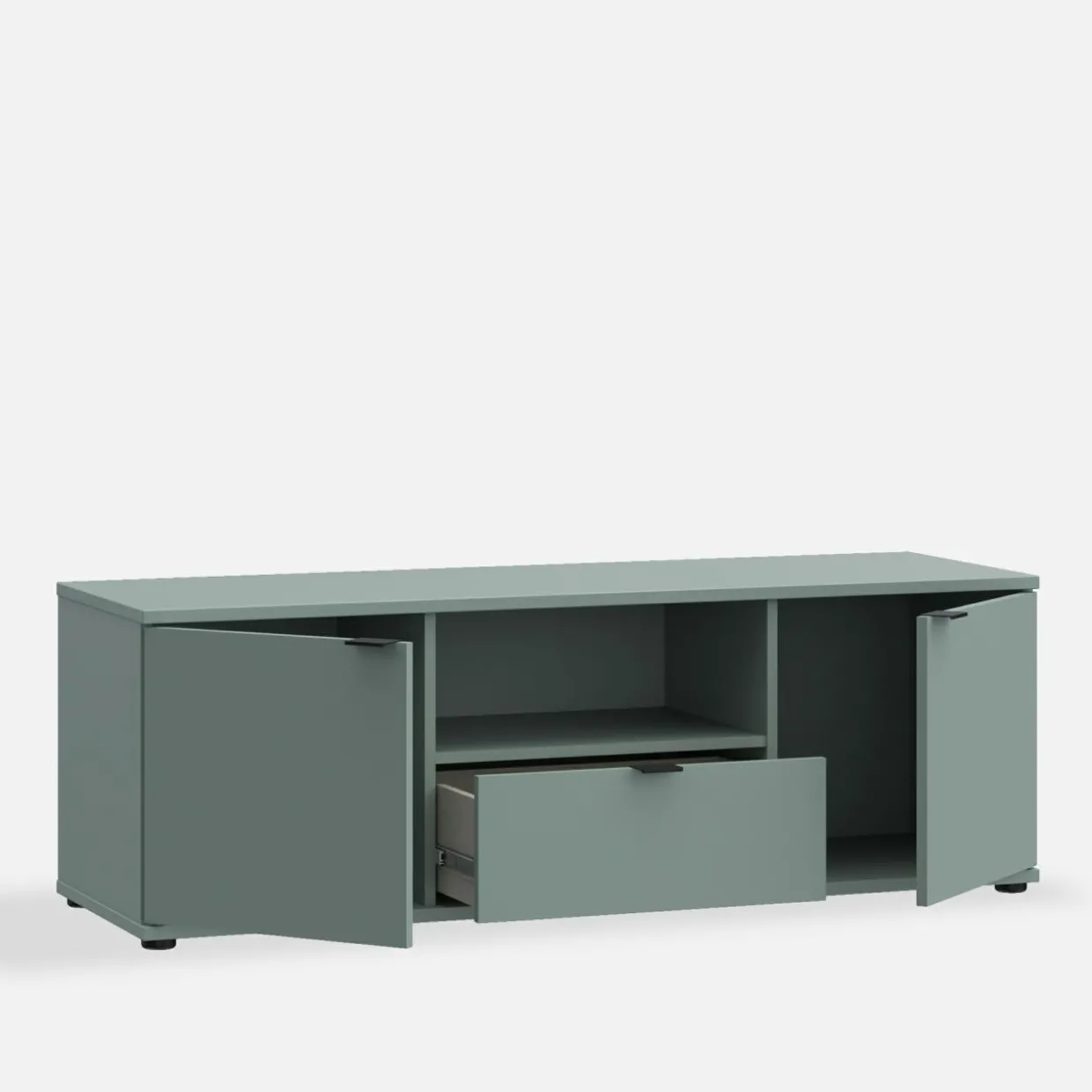 Szafka RTV GANYMEDE w odcieniu szałwi to miejsce na sprzęt multimedialny i akcesoria.