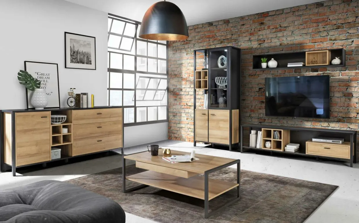 Szafka RTV HIGH ROCK podkreśli loftowy charakter salonu.