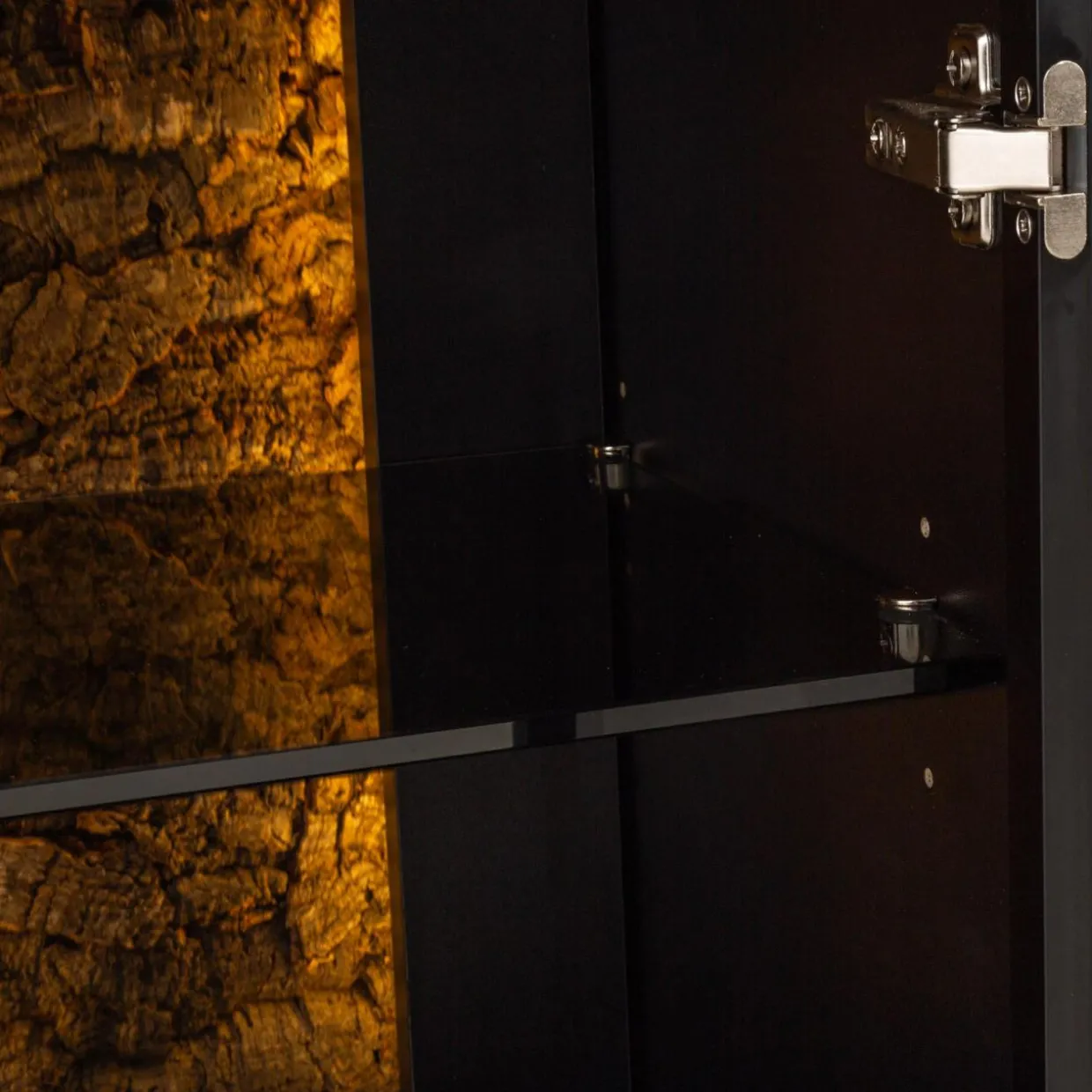 - Półki i witryny wykonane z ciemnego szkła podkreślają naturalne rysunki słojów i osadzoną w głębi korę.