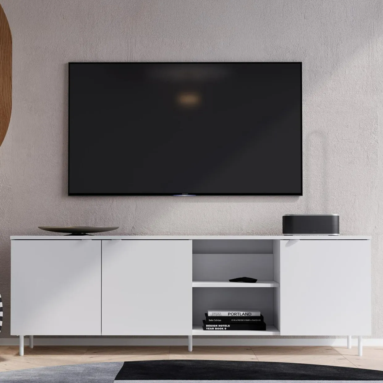 Nowoczesne meble do salonu i pokoju dziennego, wyróżniające się białym wykończeniem i metalowymi nóżkami. Minimalistyczny design i przemyślane detale sprawiają, że doskonale komponują się z jasnym drewnem, grafitem i pastelami, wprowadzając lekkość i estetykę do wnętrza.