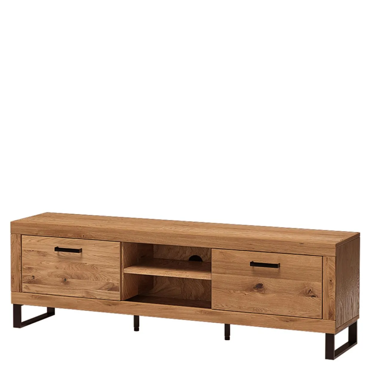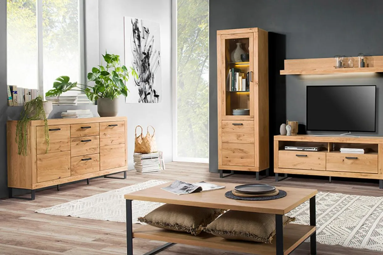 - Charakterystyczne czarne, metalowe uchwyty oraz nogi podkreślą prostą bryłę mebla, a wykończone olejem fronty z litego drewna nadadzą wnętrzu naturalnego stylu.