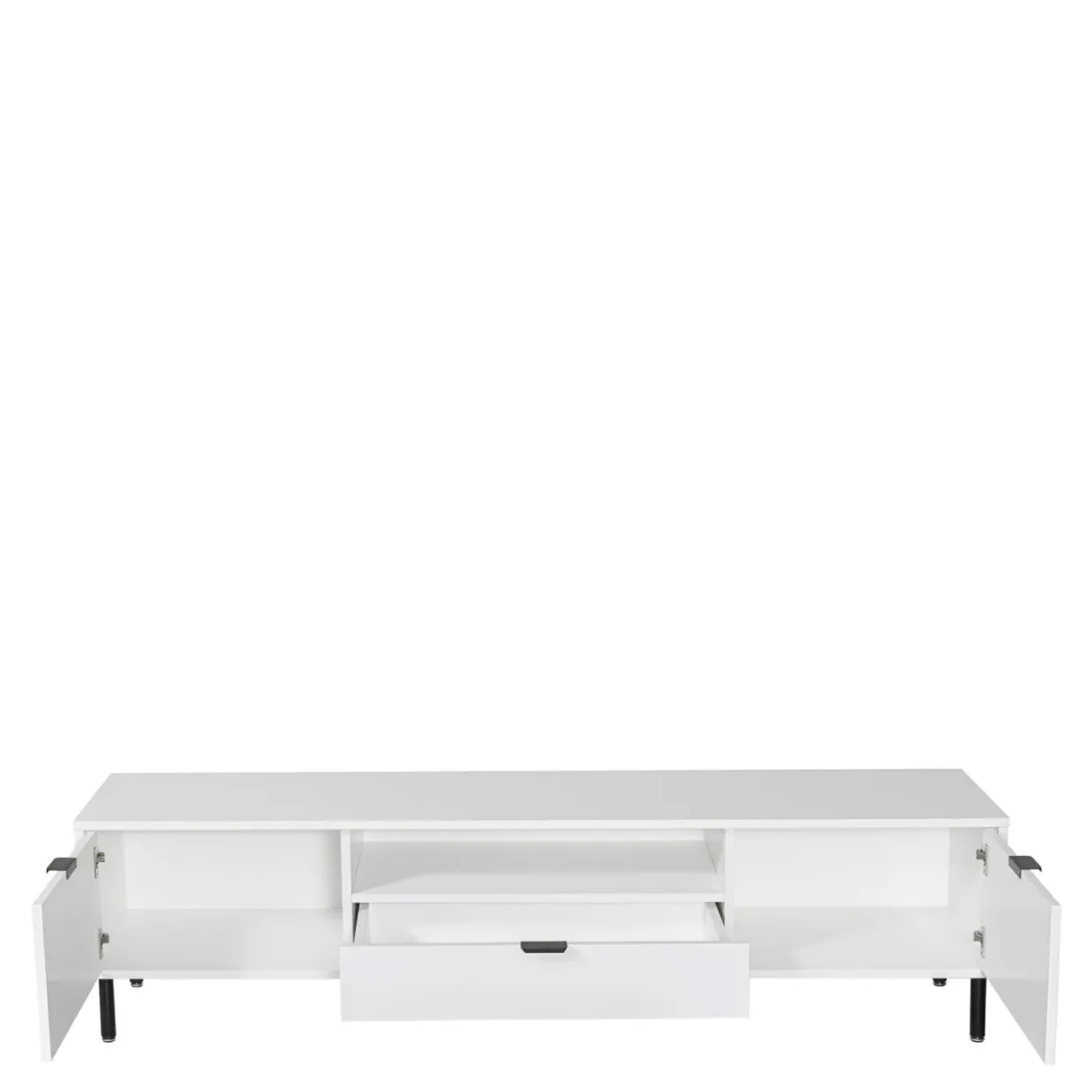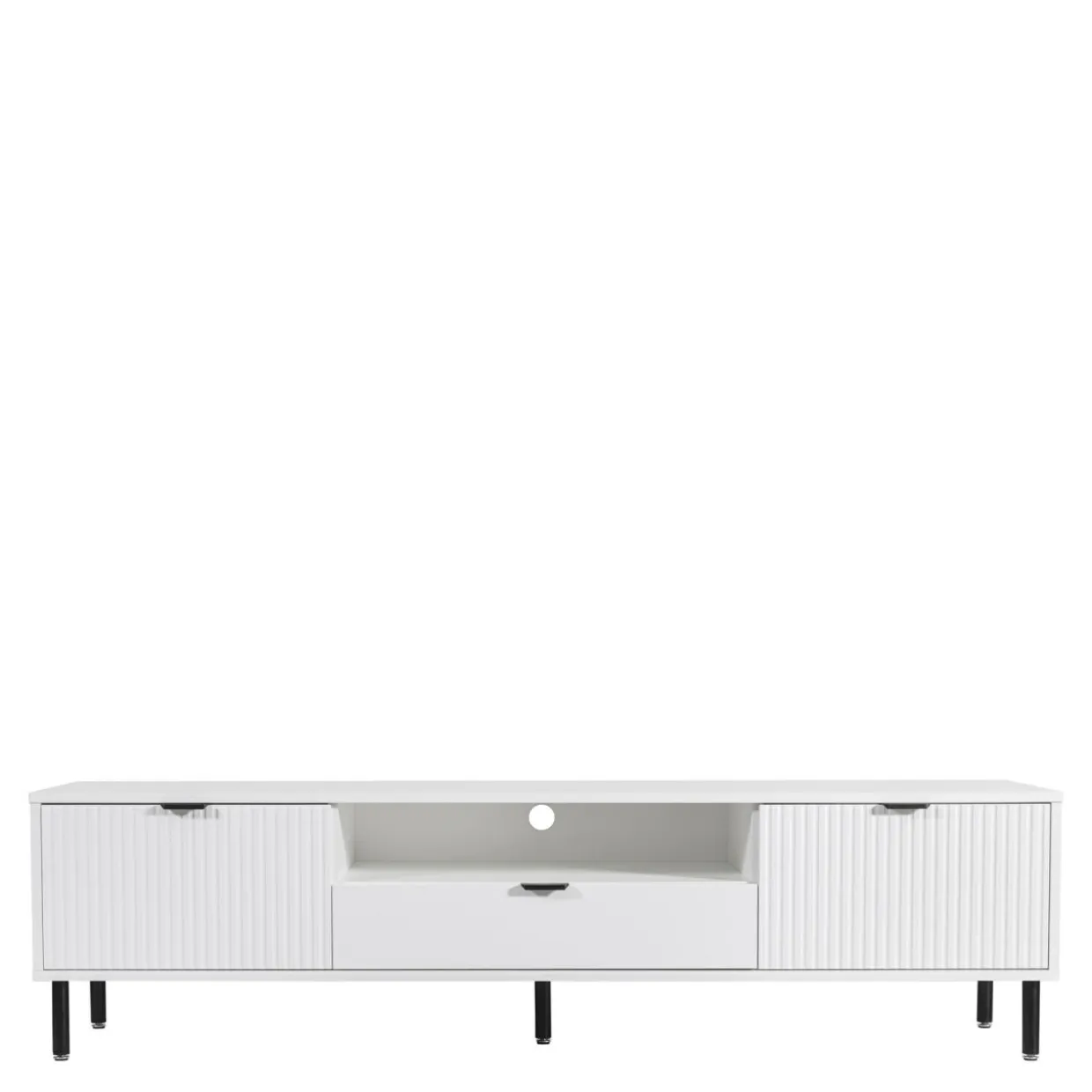 Szafka RTV WAVE w kolorze białym posiada efektowne ryflowanie oraz proste czarne metalowe uchwyty.
