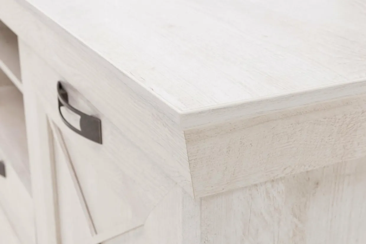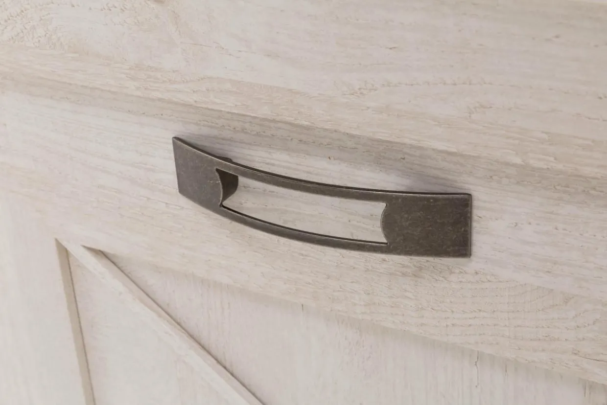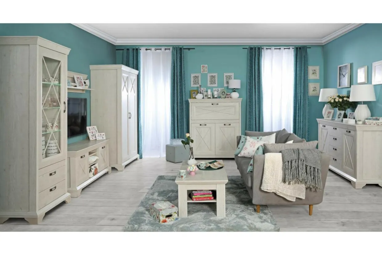 Dzięki szafce RTV konsekwentnie zrealizujesz swoją wizję salonu stylizowanego na wnętrza domostw z krainy lawendy. Bryła mebla umieszczona została na ozdobnym cokole, a metalowe uchwyty świetnie korespondują z jasnym wybarwieniem, imitującym pobielane drewno. Dodatkowym ozdobnym akcentem są skrzyżowane listewki na froncie.