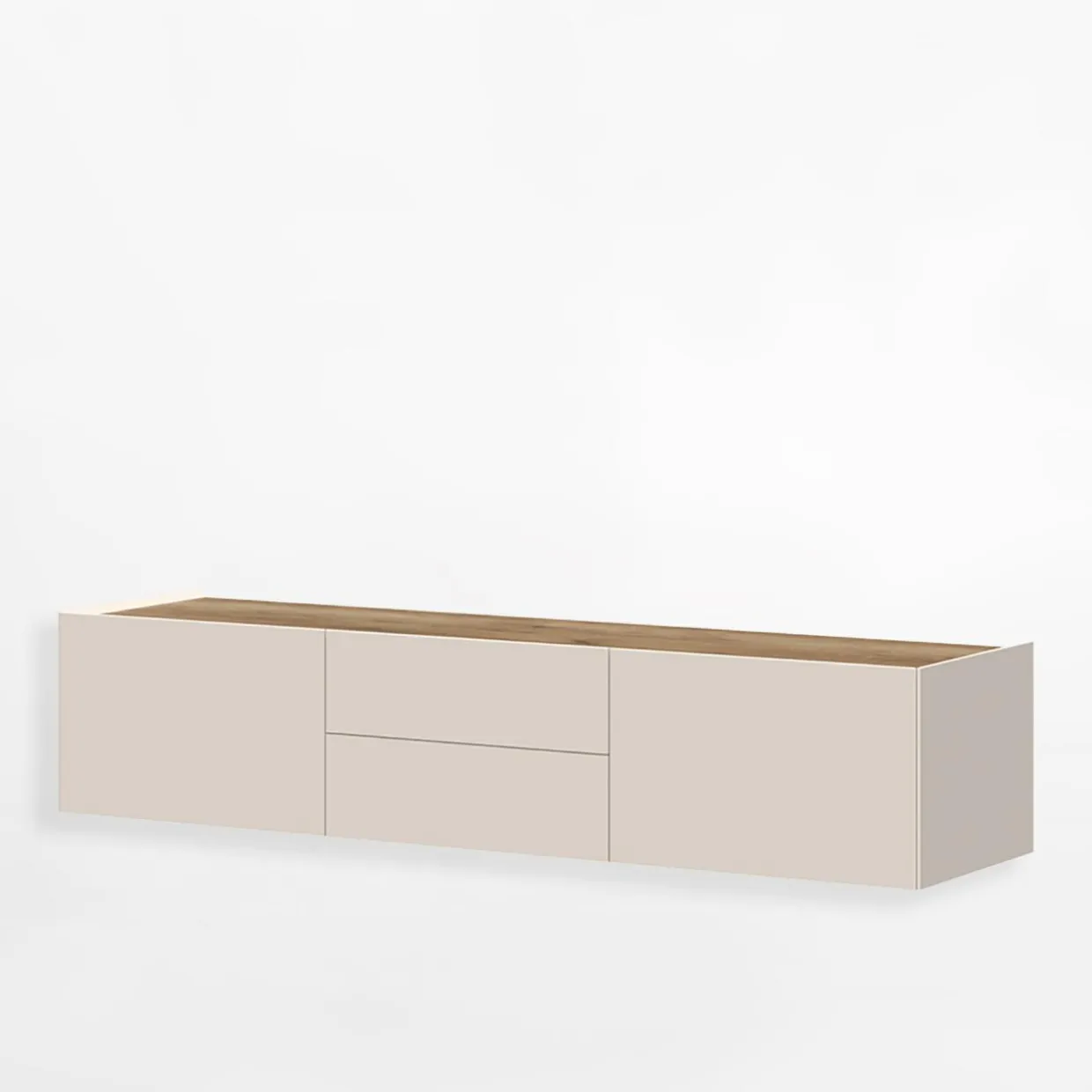 Kolekcja SKY45 to nowoczesne meble w kolorze kaszmiru z ciepłymi akcentami dębu tobacco. Prosta forma, starannie dopracowane detale i opcjonalne oświetlenie LED sprawiają, że idealnie pasują do współczesnych wnętrz. System cichego domyku, pojemne szuflady i wysokie nóżki zapewniają wygodę użytkowania i łatwość utrzymania porządku.
