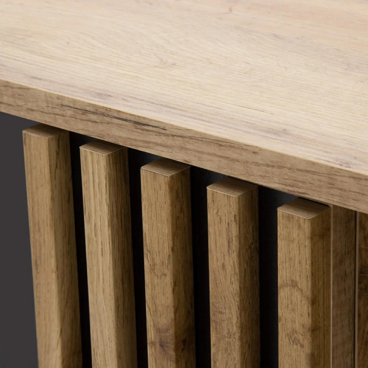 - Ciepły kolor dębu wotan, czarne, minimalistyczne fronty bez uchwytów i ozdobne lamele – całość prezentuje się elegancko i sprawi, że Twój salon nabierze nowego charakteru.