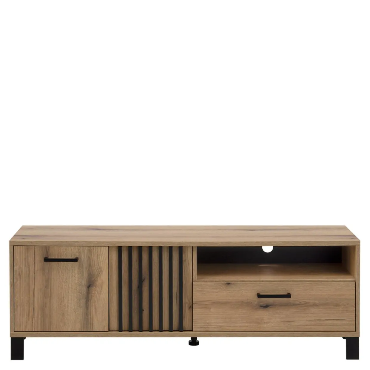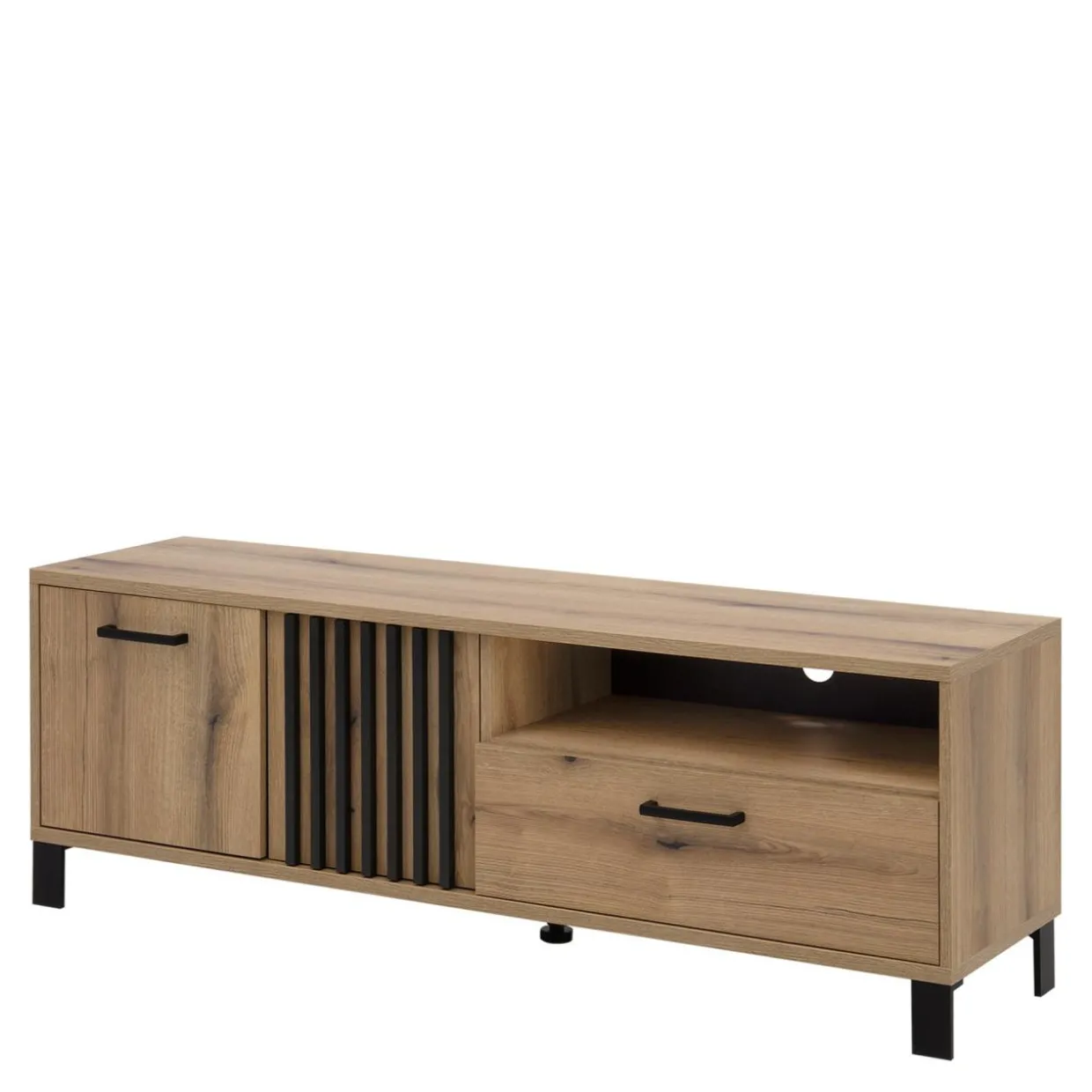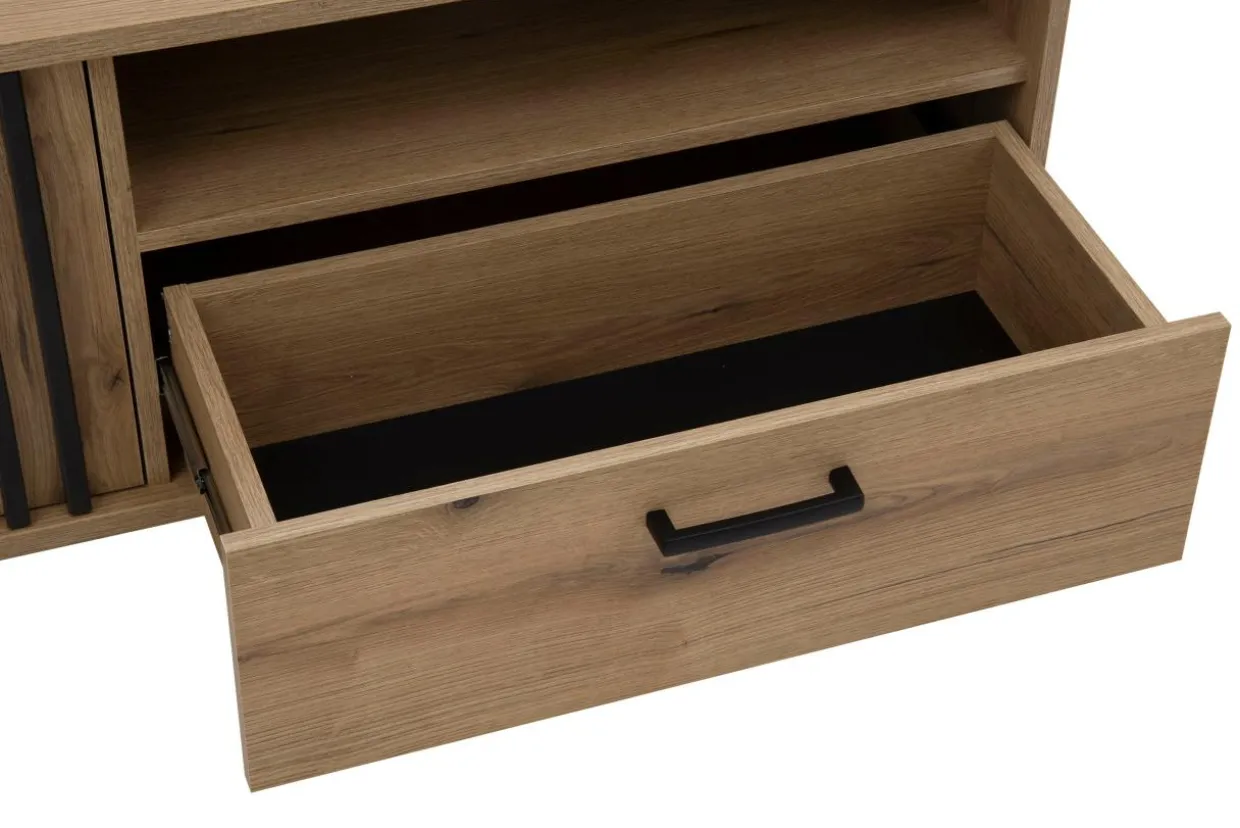 Połączenie laminatu imitującego drewno z czarnymi nóżkami i lamelami na froncie sprawia, że mebel odnajdzie się we wnętrzach urządzonych w stylu nowoczesnym i japandi.