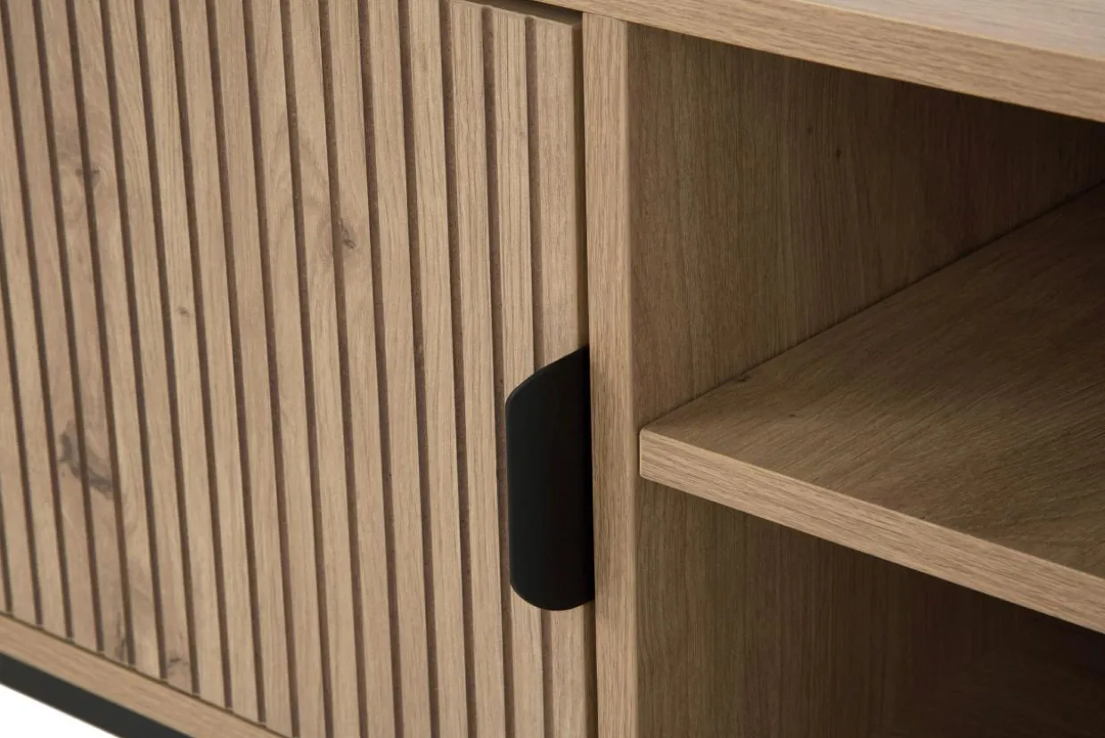 - Szafka RTV posiada fronty z ozdobnym żłobieniem, dzięki czemu przykuje uwagę i będzie stanowić punkt centralny w aranżacji wnętrza.