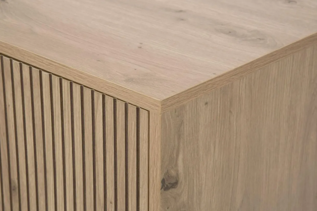 Przełam monotonię i ożyw wnętrze za pomocą ozdobnych żłobień na frontach – ryflowanie to jeden z najważniejszych trendów w projektach meblowych. Nieskomplikowana bryła i barwa jasnego drewna czyni kolekcję uniwersalną, pasującą do wiele stylów wnętrz.